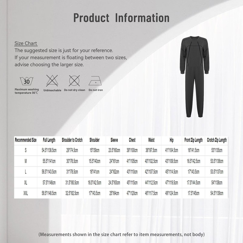 | Tag No. | Recommended Size | Full Length | Shoulder to Crotch | Shoulder | Sleeve | Chest | Waist | Hip | Front Zip Length | Crotch Zip Length |