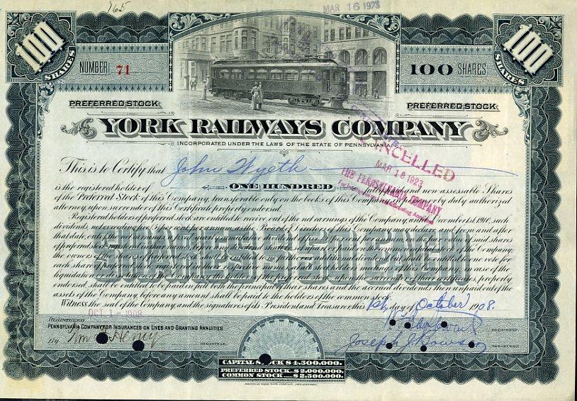 1908 York Railways Stock Certificate (PA). Nice street railroad scripophily certificate with vignette of electric trolley and city buildings. VF+ condition with stamp and punch cancellation.