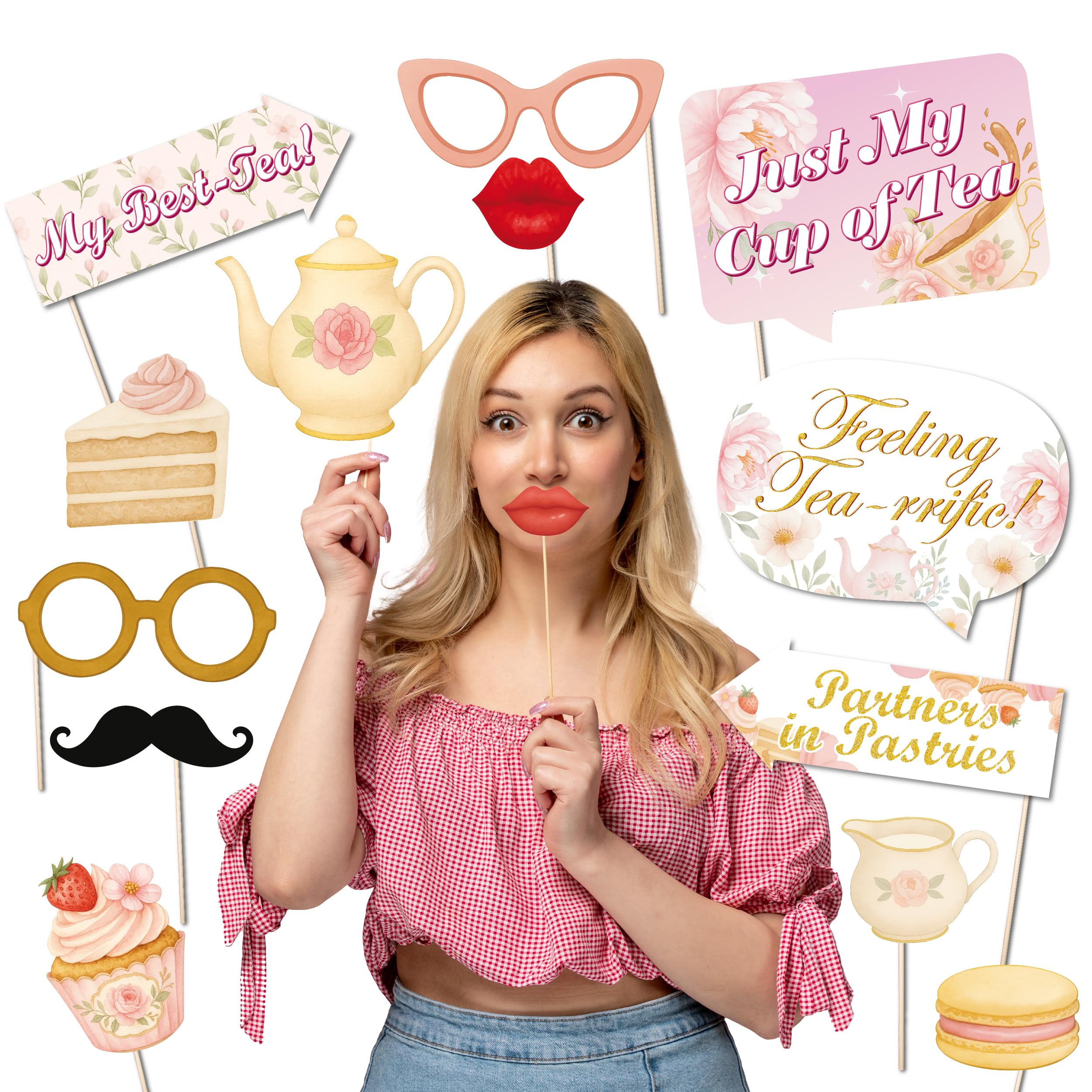 You're Officially Invited to the Most Charming Tea Party Ever! Put the kettle on and get ready for a delightful celebration! Our Tea Party Photo Booth Props are the perfect ingredient for a fun-filled gathering. Whether you’re hosting a whimsical garden party or a sophisticated afternoon tea, these props will add a touch of magic to your event. What's in the Box? 20 x High-Quality Tea Party Themed Cardstock Props 20 x Sturdy Wooden Dowels 20 x Super-Strong Glue Stickers for Easy Assembly Why Our Props Are the Perfect Blend: Made from durable cardstock with enchanting designs, our props are sure to be the centerpiece of your party. The included wooden sticks and simple glue stickers make assembly a breeze, so you can focus on what's important—enjoying the party! This kit offers a wonderful variety of props that will have everyone excited to strike a pose. From elegant teacups to playful hats, your guests will have a blast creating memories that are as sweet as a sugar cube. Perfect for: Garden & Floral-Themed Parties Bridal & Baby Showers "Tea for Two" & "Par-Tea" Themed Birthdays Mother's Day Brunches
