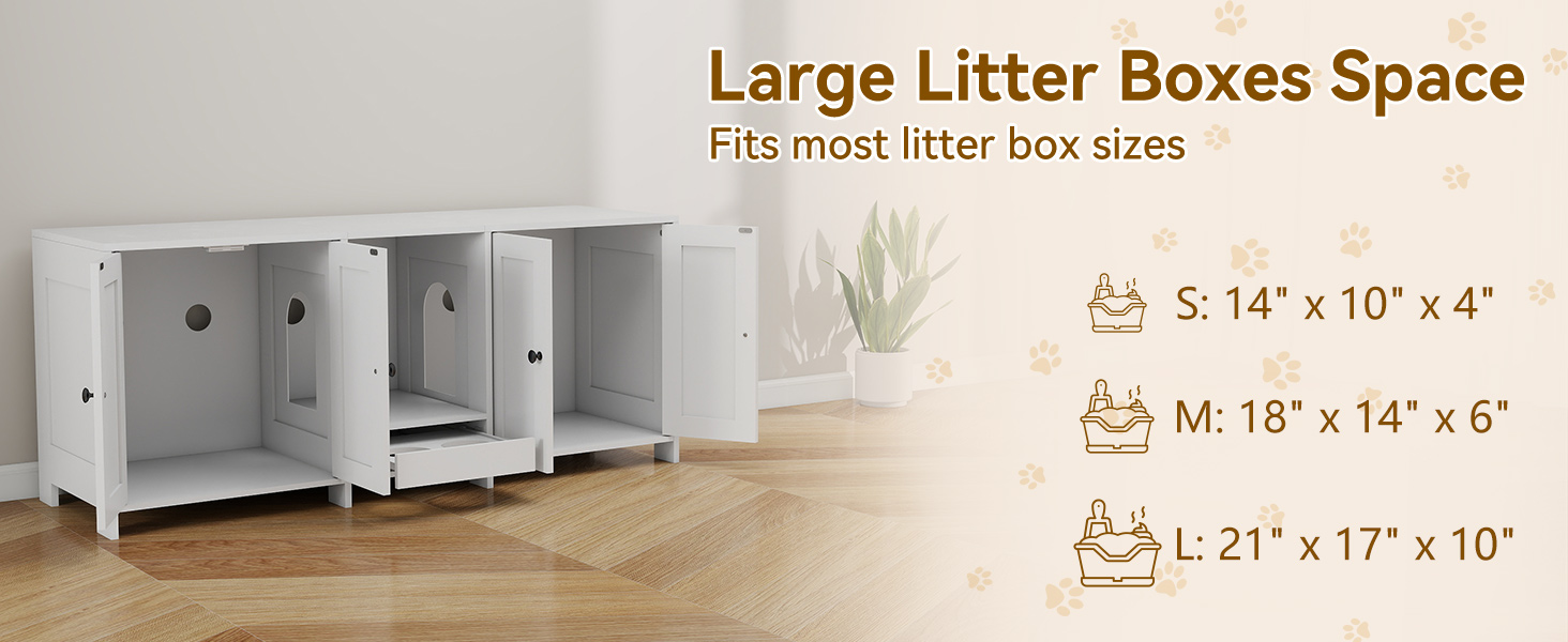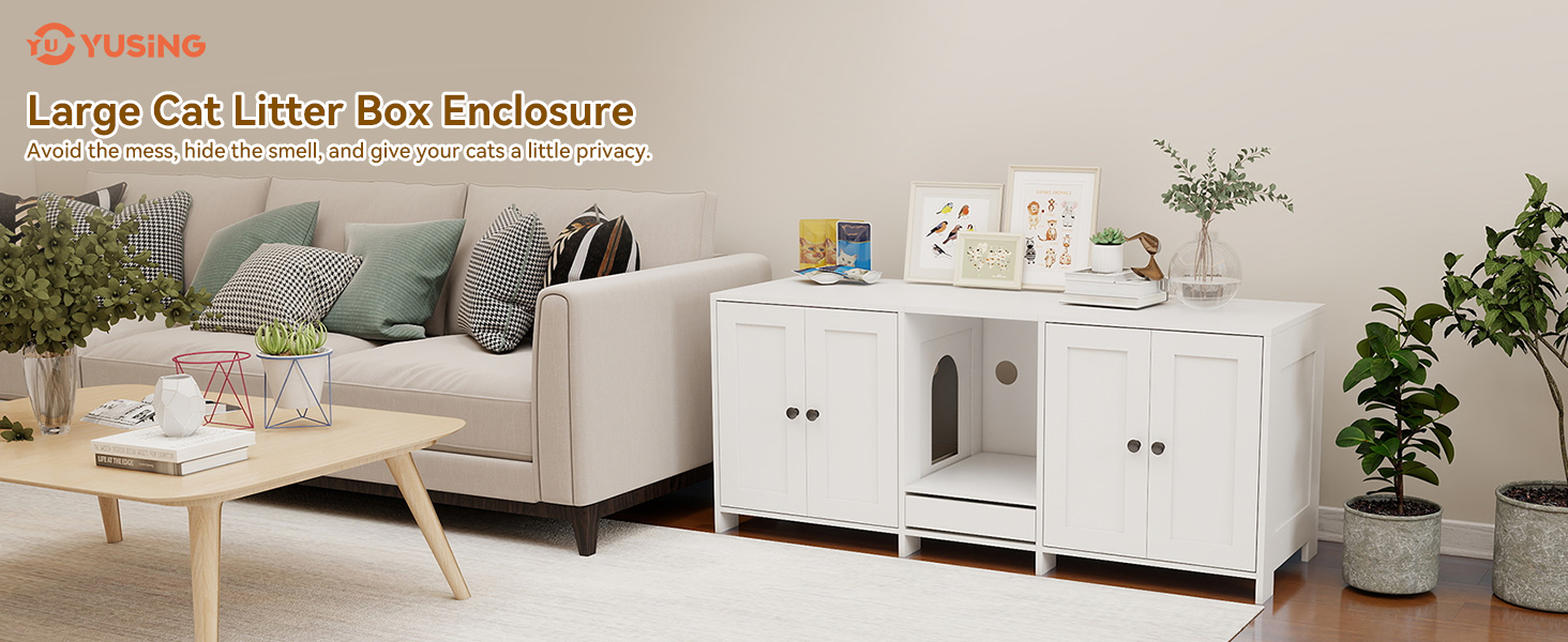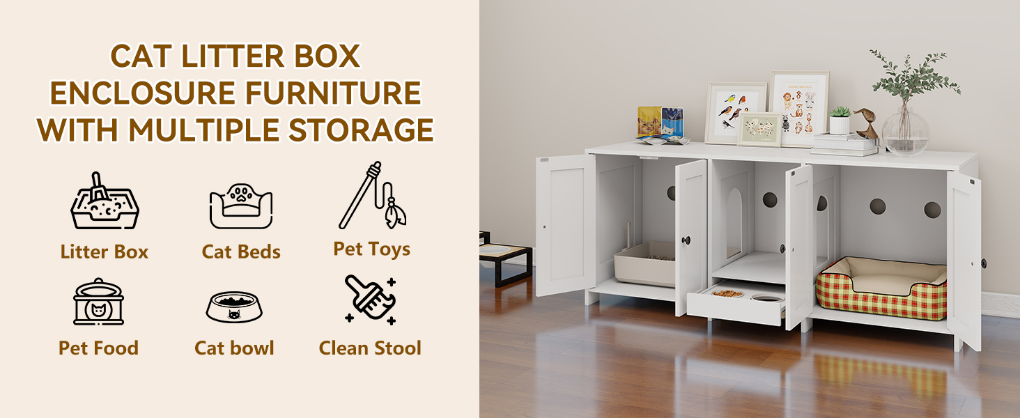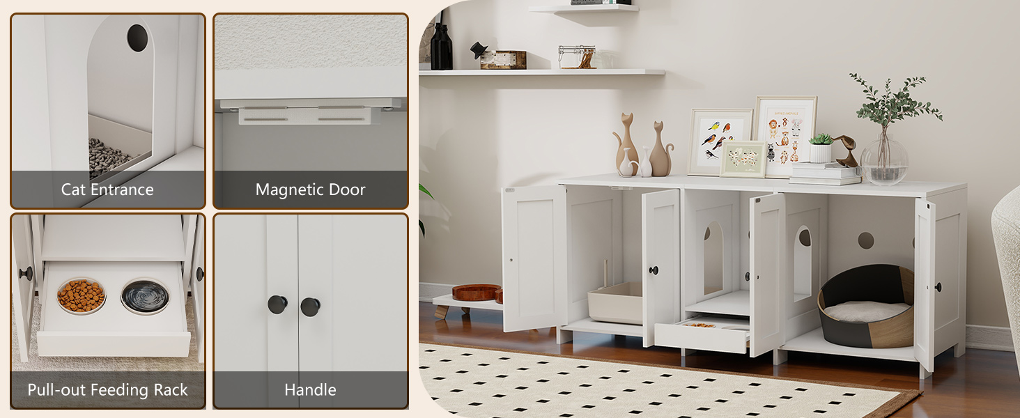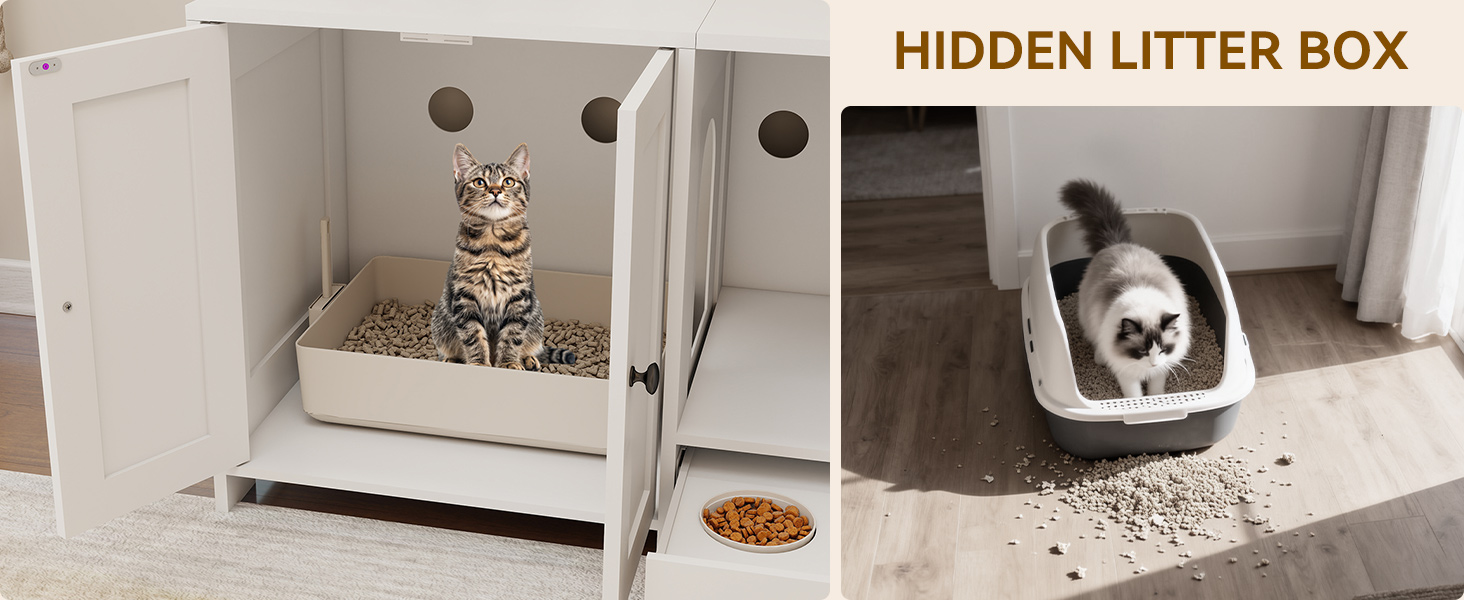 One-stop concealed integration: An innovative design that hides two litter boxes and a feeding station simultaneously, completely solving the clutter problem in multi-cat households.