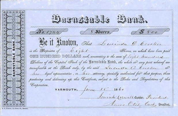 1860 Barnstable Bank Stock Certificate. Scarce pre Civil War Cape Cod Massachusetts bank scripophily certificate. VF+ condition