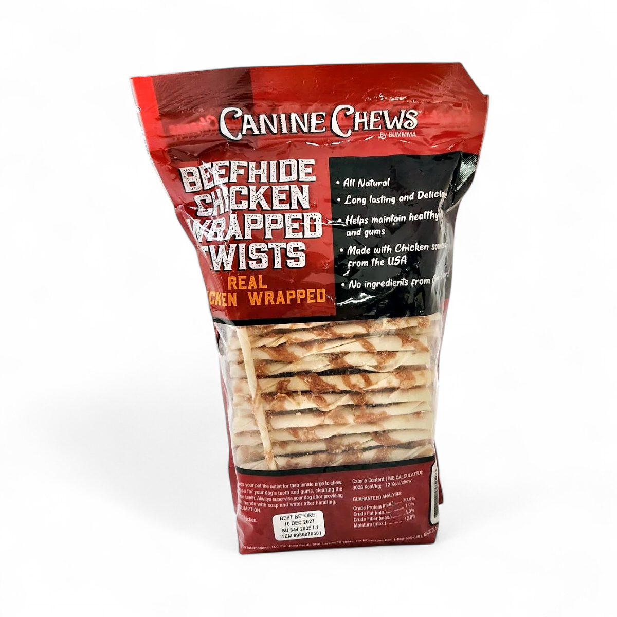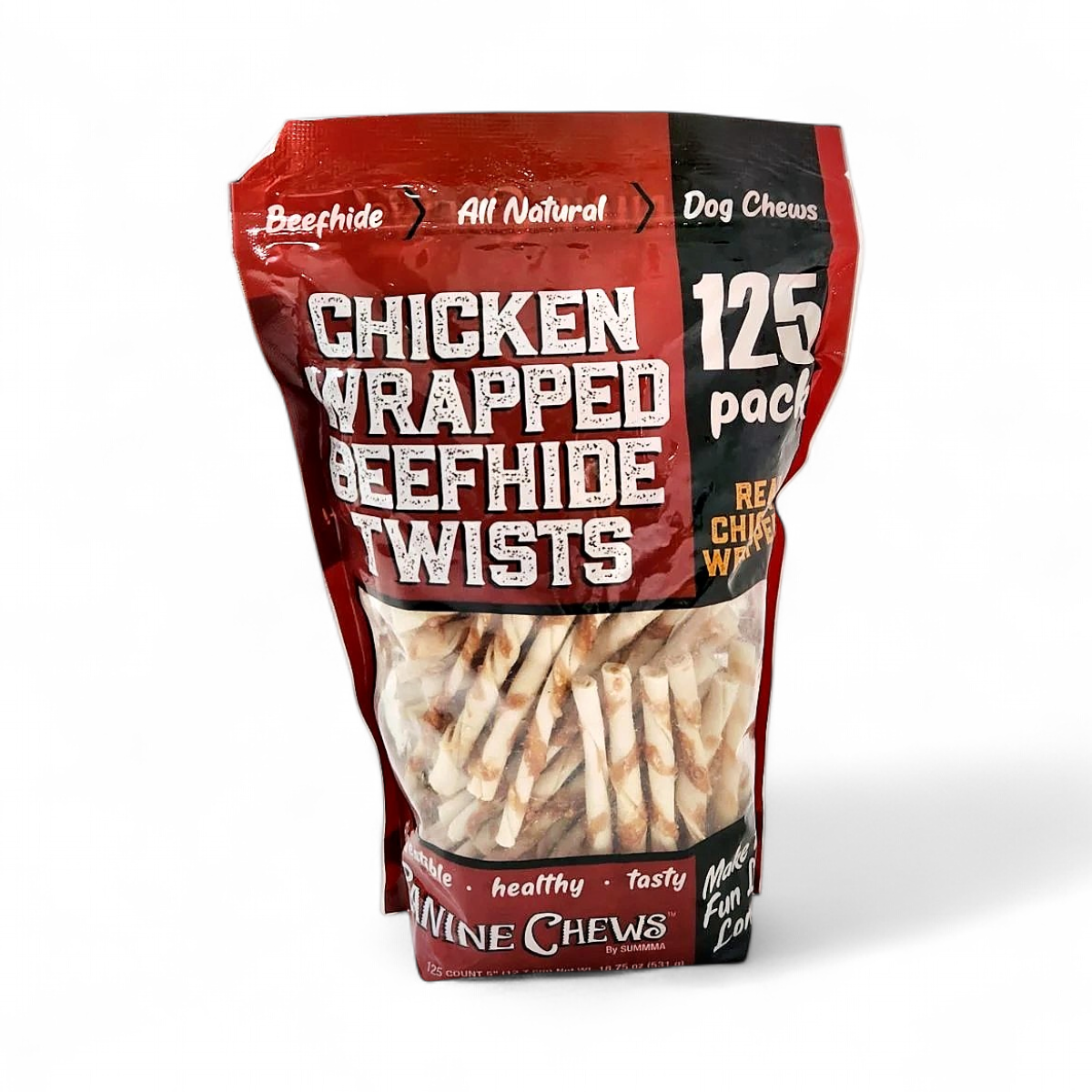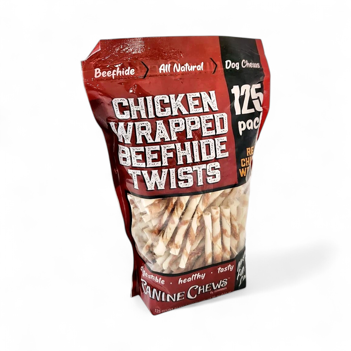 This listing is for Canine Chews Chicken-Wrapped Rawhide Treat Chews for Dogs, provided in a convenient pack of 125 count. These treats offer a delicious and satisfying chewing experience for your canine companion.
