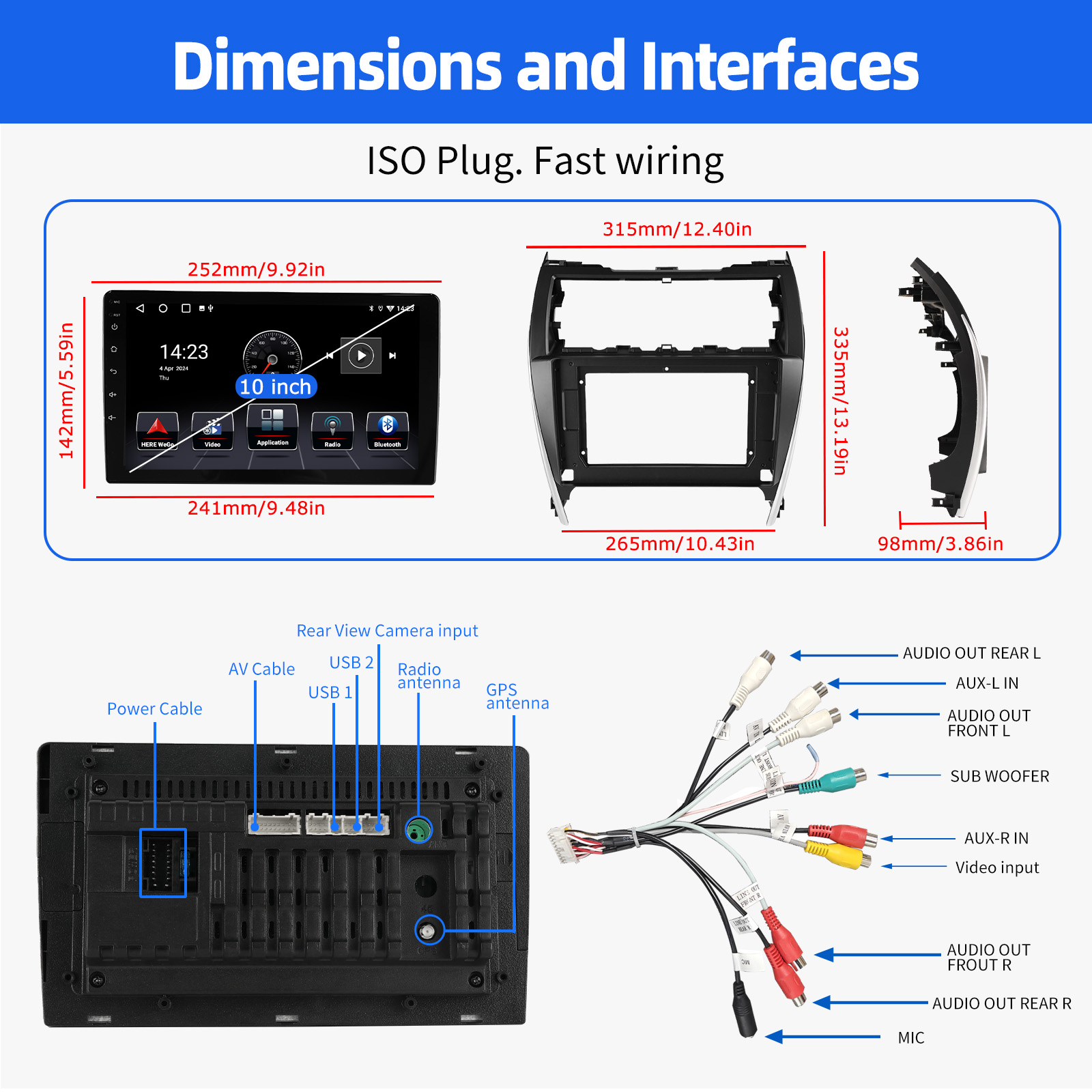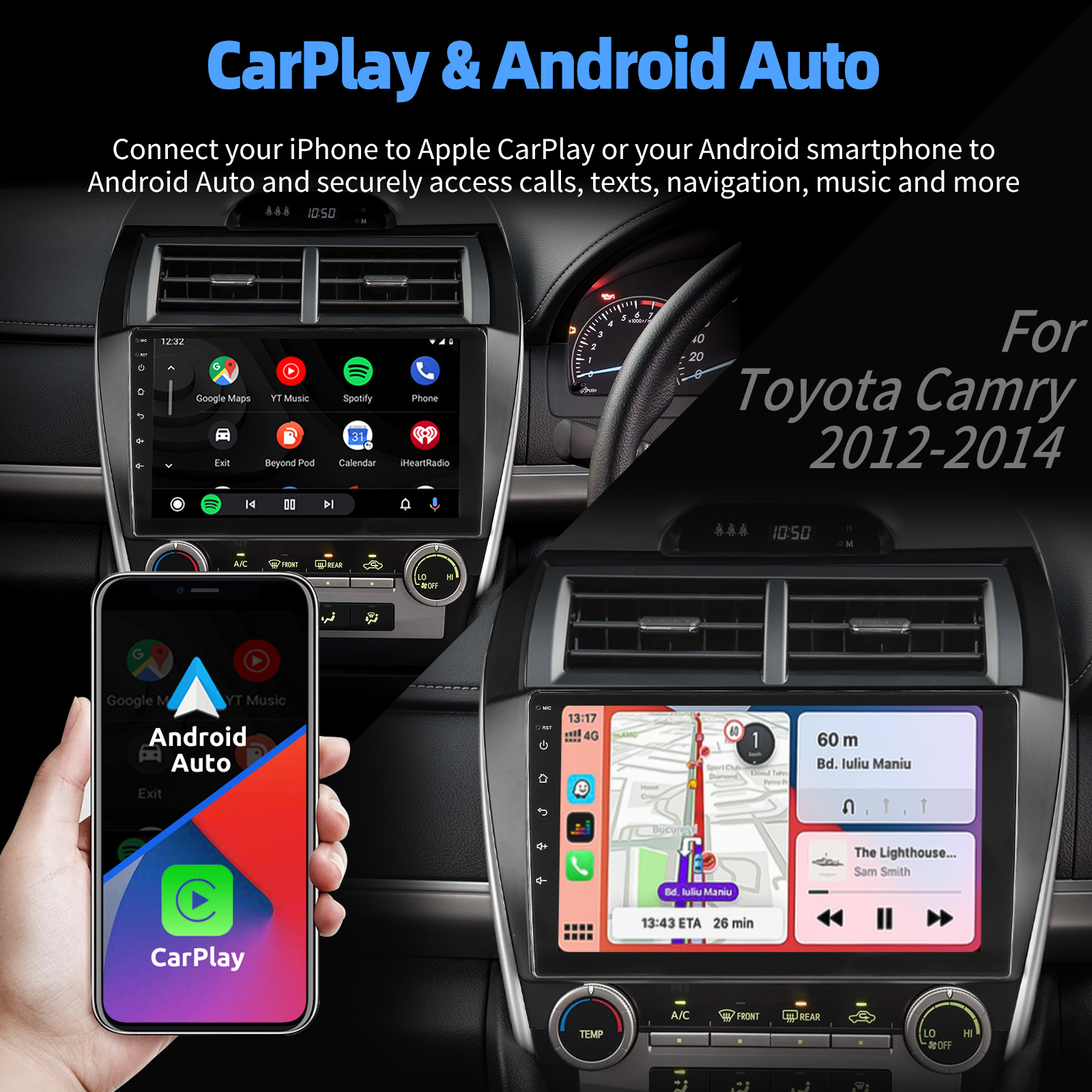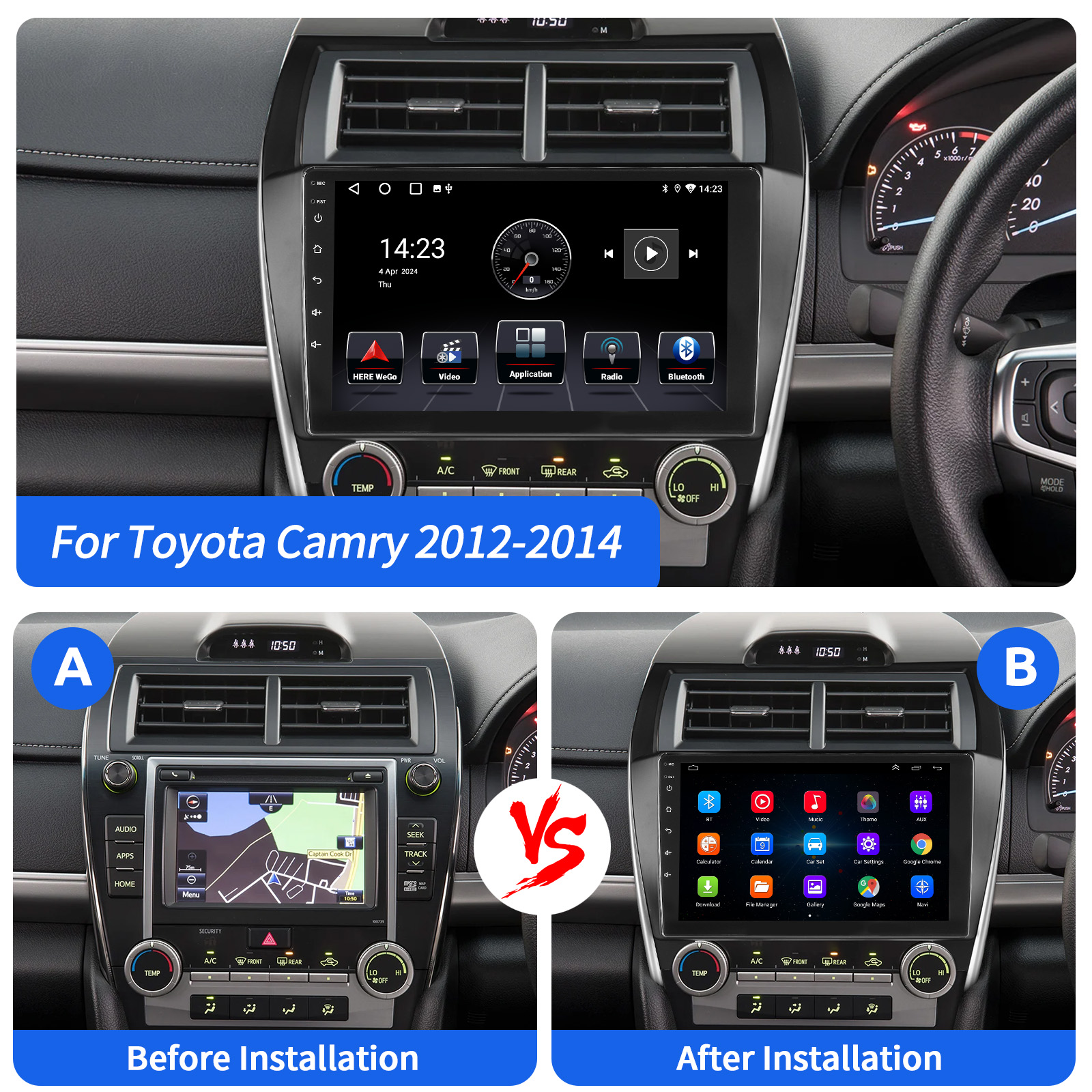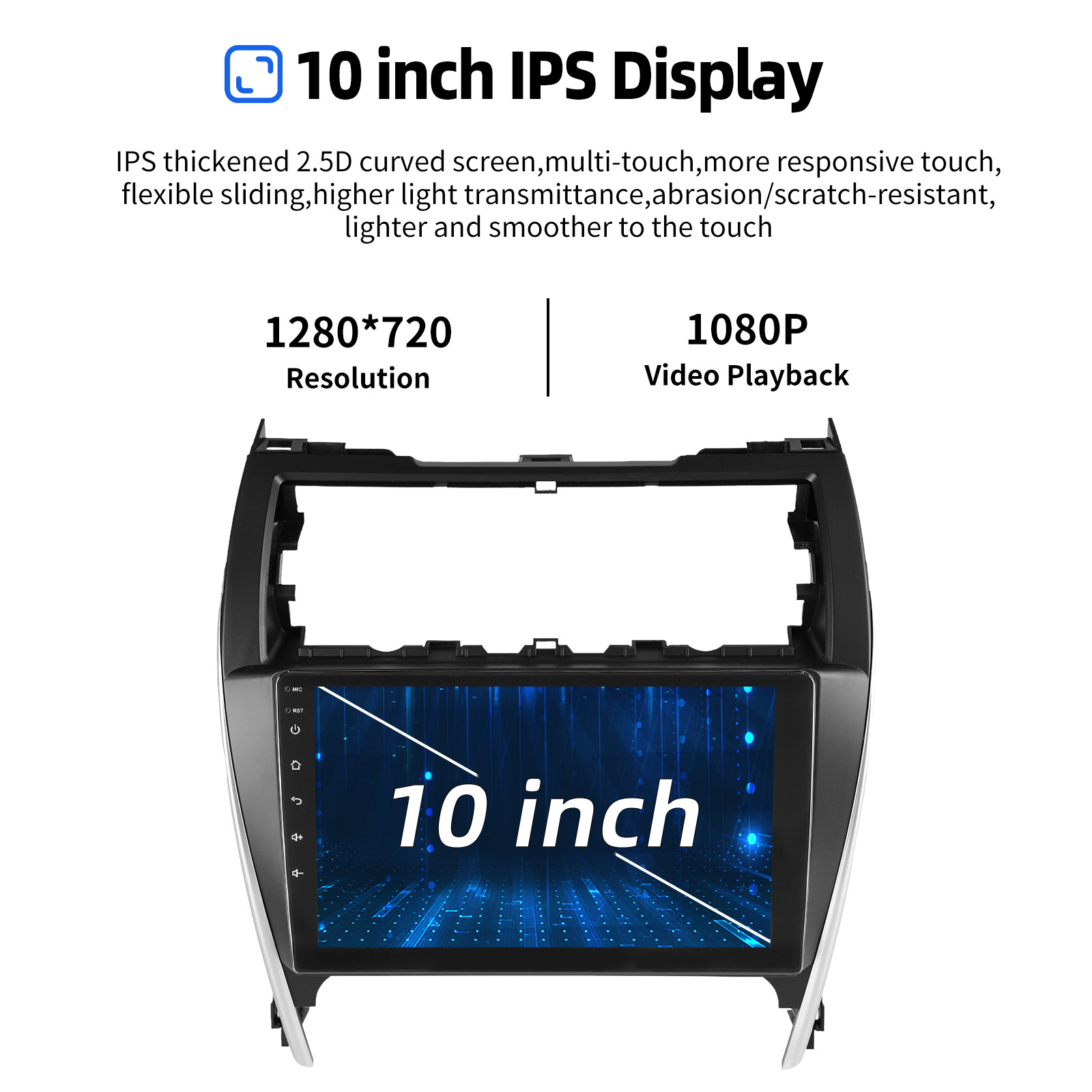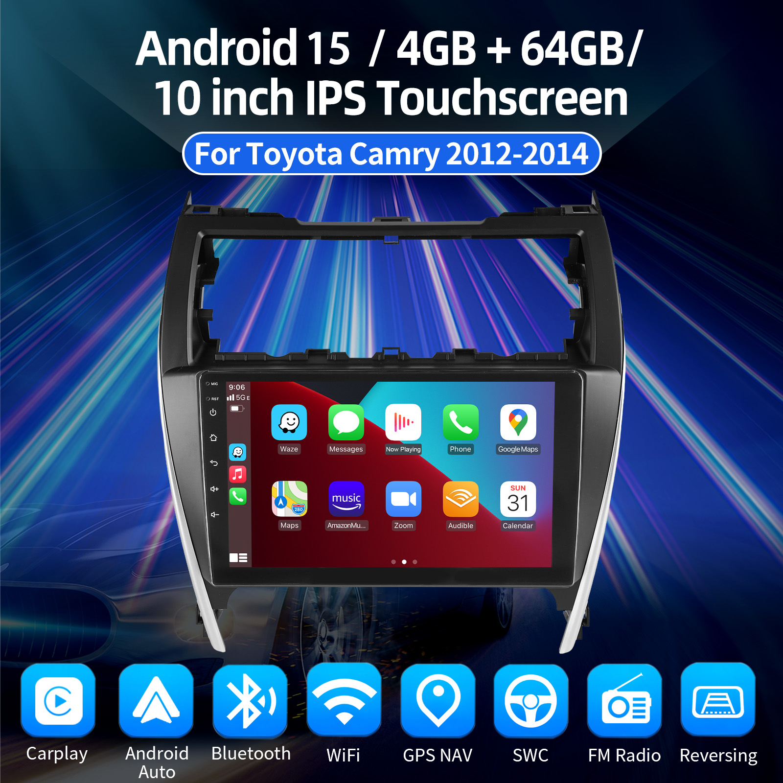 10.1 Inch Android 15 Car Radio For Toyota Camry 2012-2014: The Android car radio with 10.1" 1280*720 2.5D HD capacitive touch screen, 4GB RAM and 64GB ROM allows you to download your favorite apps and videos, so that driving will never be boring .No additional frame, no cable change, plug and play.