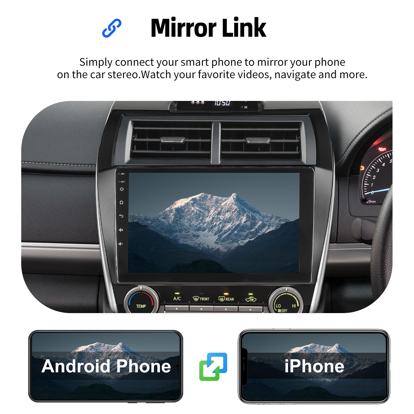 MIRROR LINK & APPLE CARPLAY & ANDROID AUTO: With this car radio, you can experience the amazing Mirror Link function, compatible with iOS and Android phones. You can mirror your smartphone screen to the car radio using apps like Google Maps, Spotify, Youtube, etc. Replace your cell phone with the car screen and turn your vehicle into a smart platform. Immerse yourself in a seamless and user-friendly infotainment experience with Apple CarPlay & Android Auto. Connect your iPhone to Apple CarPlay or your Android smartphone to Android Auto and securely access calls, texts, navigation, music and more. With intuitive operation via the touchscreen or voice control, you have all functions at your fingertips while you remain safely at the wheel. Use your favorite apps and stay connected at all times while keeping your eyes on the road. Turn your vehicle into an extended hub for your mobile devices and experience a new dimension in infotainment.