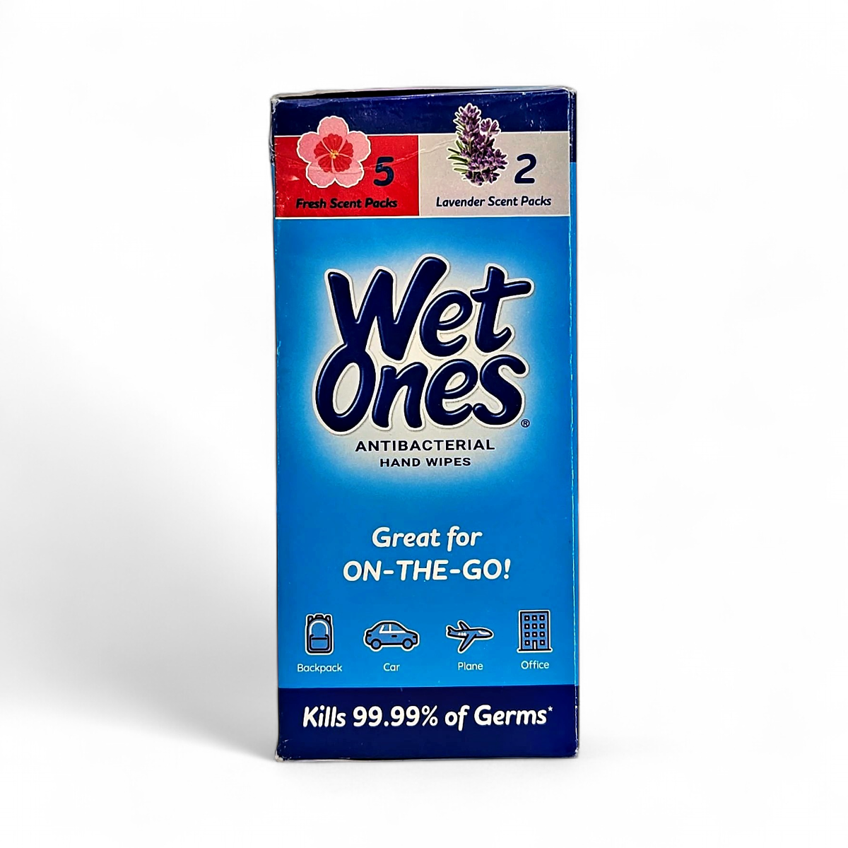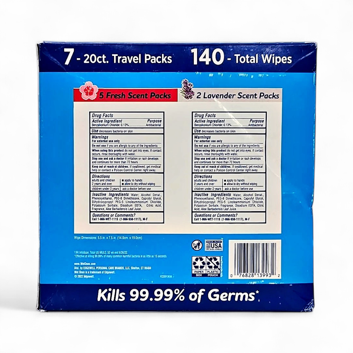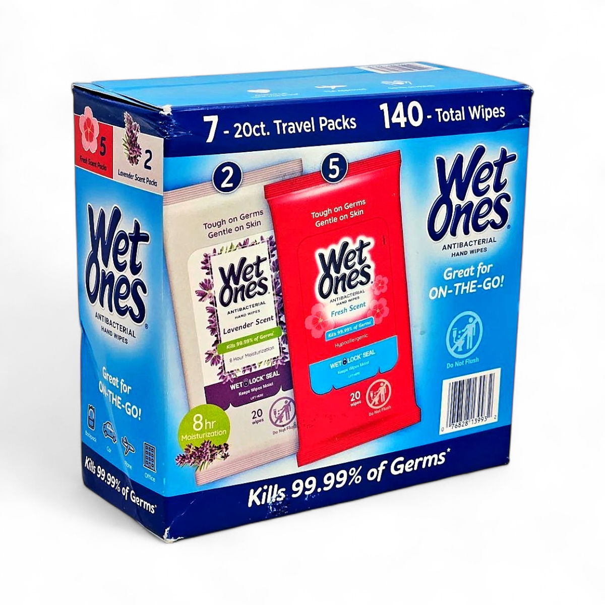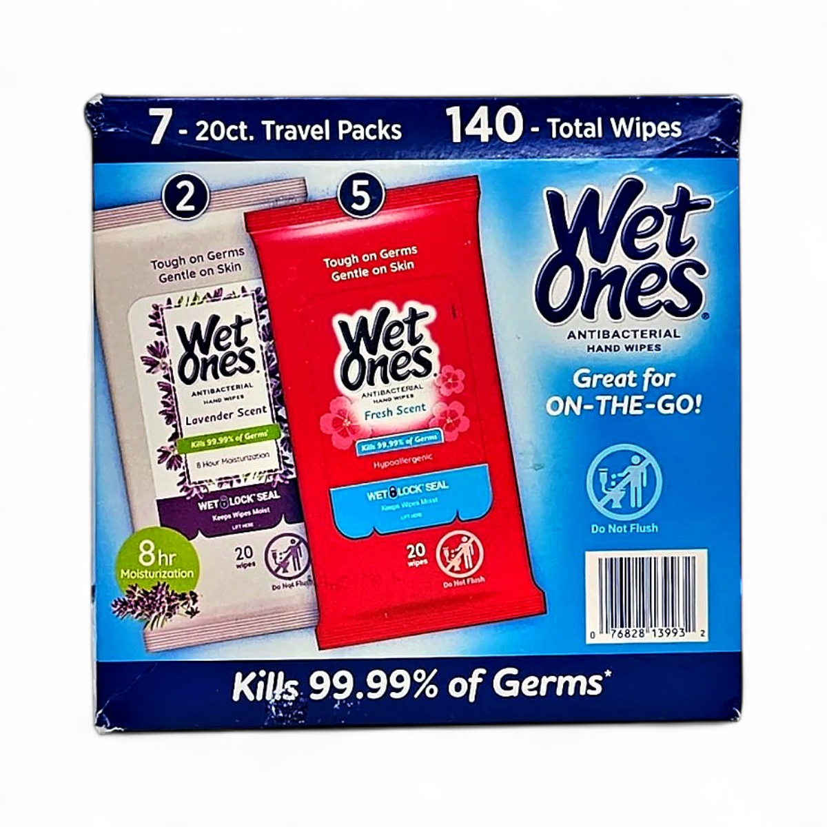 This listing features Wet Ones Antibacterial Hand Wipes in a refreshing Fresh Scent & Lavender combination. You will receive 7 individual packs, with each pack containing 20 wipes, providing a total of 140 antibacterial wipes.