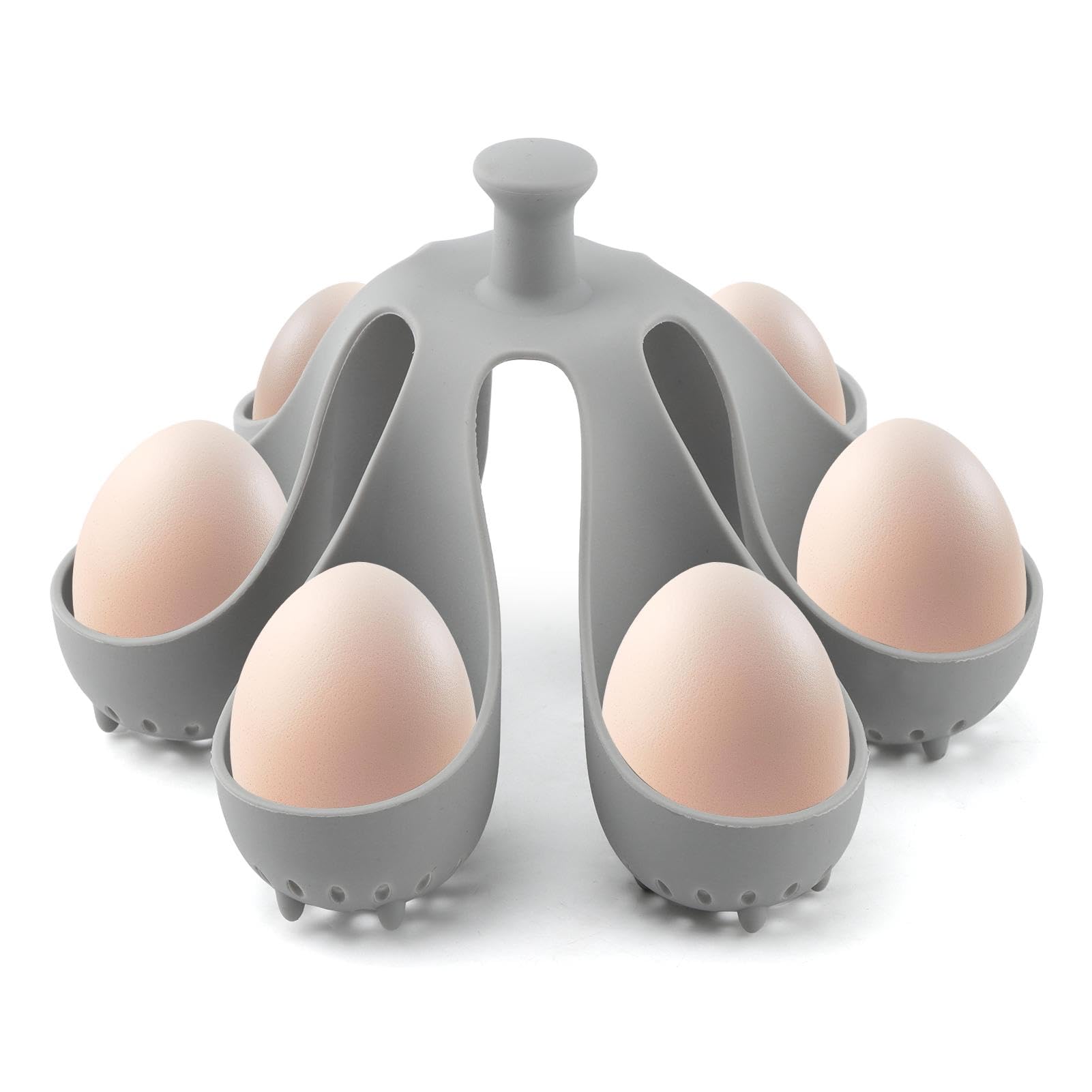 6 Egg Capacity: Silicone Egg Boiler RackCook up to 6 eggs at soft-boiled or hard-boiled firmness, the eggs come out perfectly all thetime, the shell is easy to peel, easy to clean and dishwasher safe.