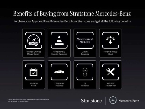Smartphone Integration includes Apple CarPlay and Android Auto, Blind Spot Assist, Satellite Navigation, Panoramic Sliding Sunroof, Heads Up Display, Electric Folding Door Mirrors, DAB Digital Radio, MBUX Multimedia System, Burmester Surround Sound System, Heated Front Seats, Ambient Lighting, Easy Pack Tailgate, Enhanced Bluetooth Telephone Preparation with Wireless Charging, Reversing Camera