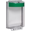 Universal Stopper Cover, Indoor, Outdoor, Color Clear, Green, Material Polycarbonate, Mounting Surface, Width 5 1/2 in, Depth 2 5/8 in, Height 8 1/8 in, For Use With Dual Action Pull Stations, Duplex Plugs, Electrical Light Switches, Emergency Buttons, Intercom Stations, Keypads for Entry Systems, Operating Temp. -20 Degrees to 120 Degrees F, Rating IP56, Standards ADA Compliant, UL/cUL Listed, Features Clear Polycarbonate Cover Helps Protect Against Vandalism and Damage