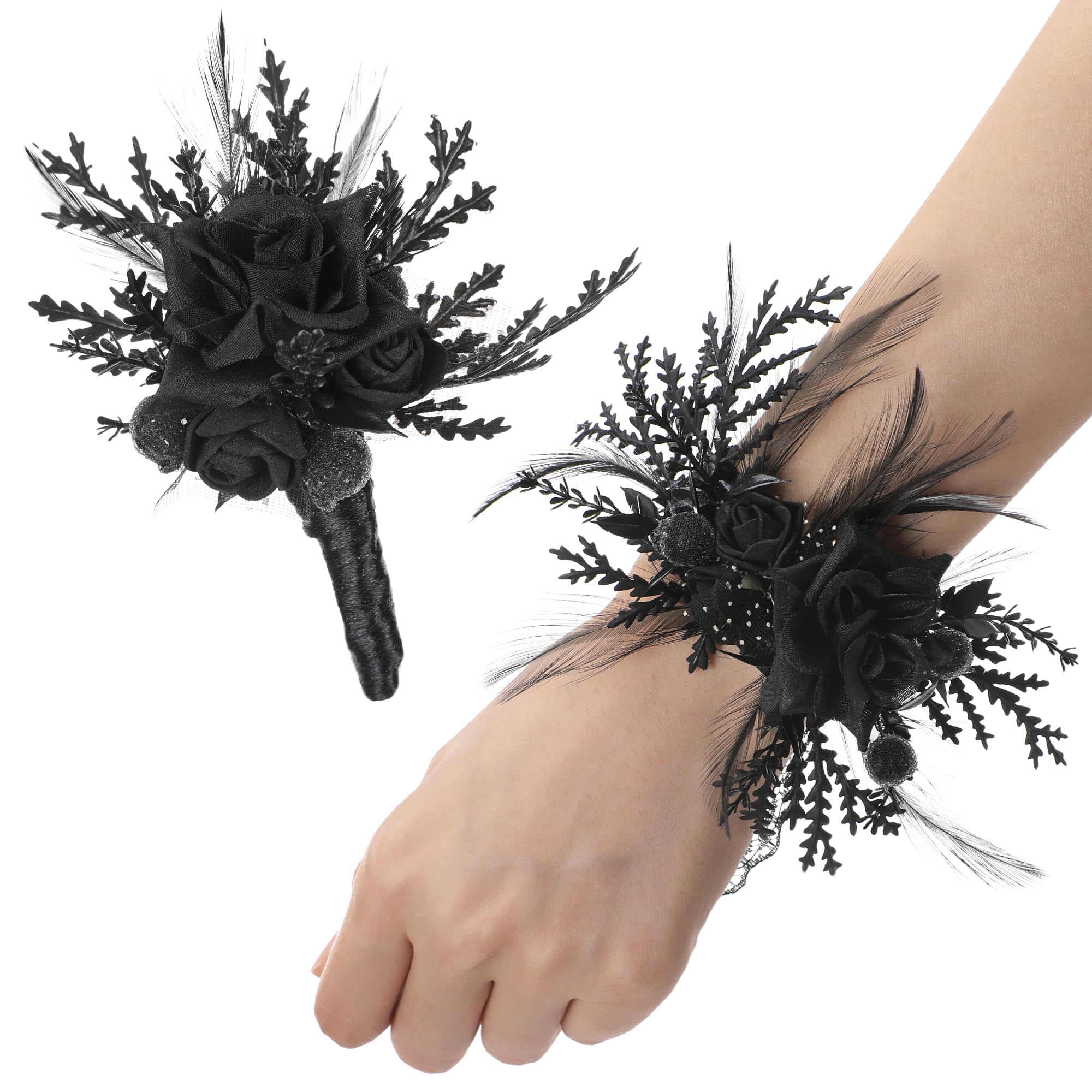 Versatile Fashion: This black corsage and wristlet set enhances a variety of outfits, offering a touch of gothic sophistication and dramatic style suitable for both formal occasions and everyday wear