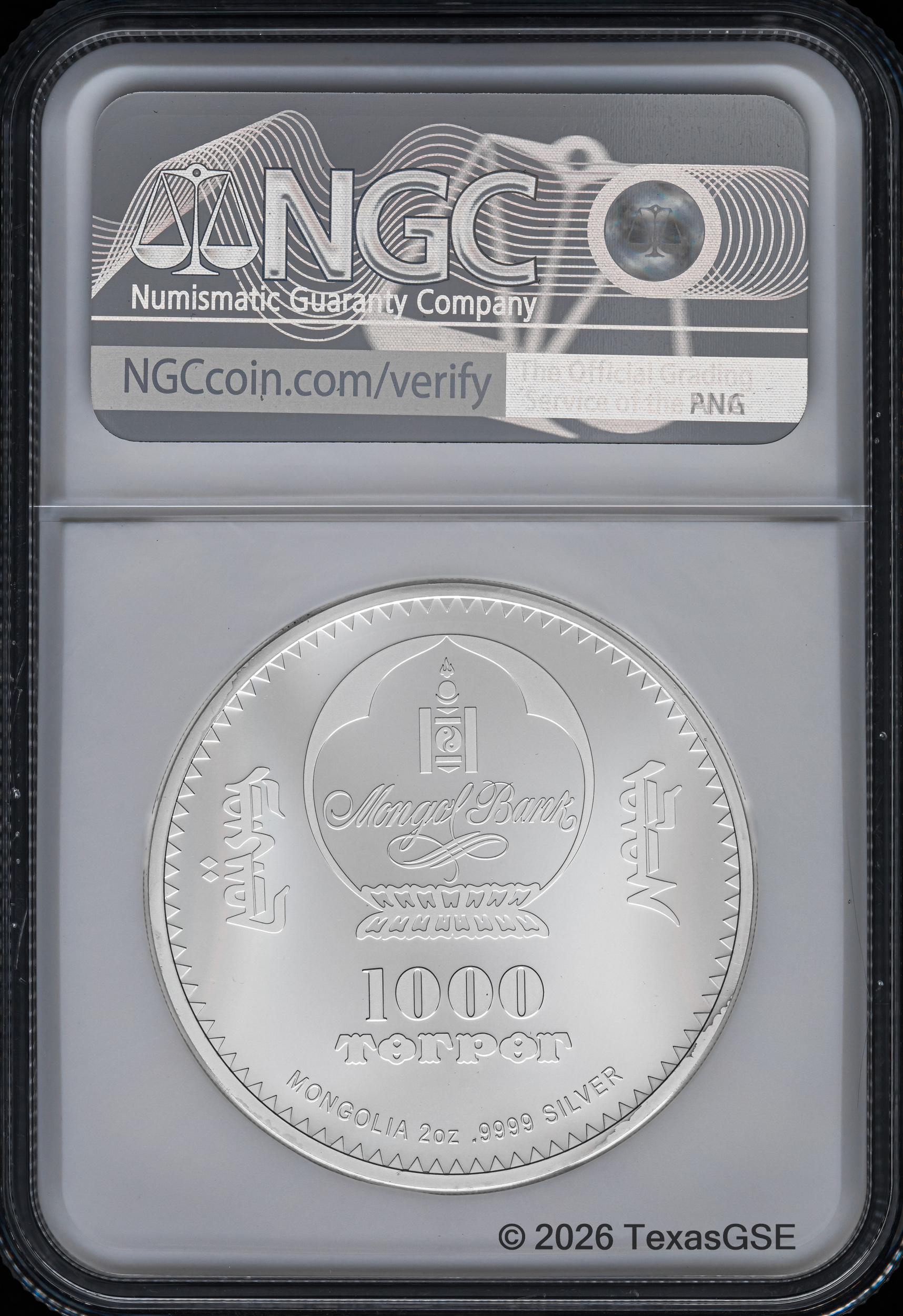 The reverse features the Mongolian Coat of Arms along with the weight, purity, and value of the coin.