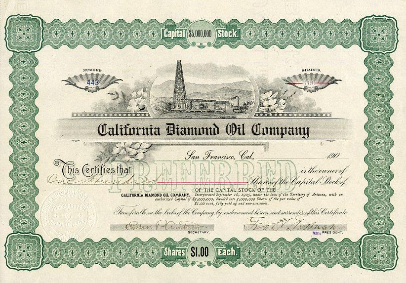 190_ California Diamond Oil Stock Certificate. Unissued, but signed by officers, this early western oil scripophily certificate has an attractive vignette of rig and pumping equipment. EF condition.