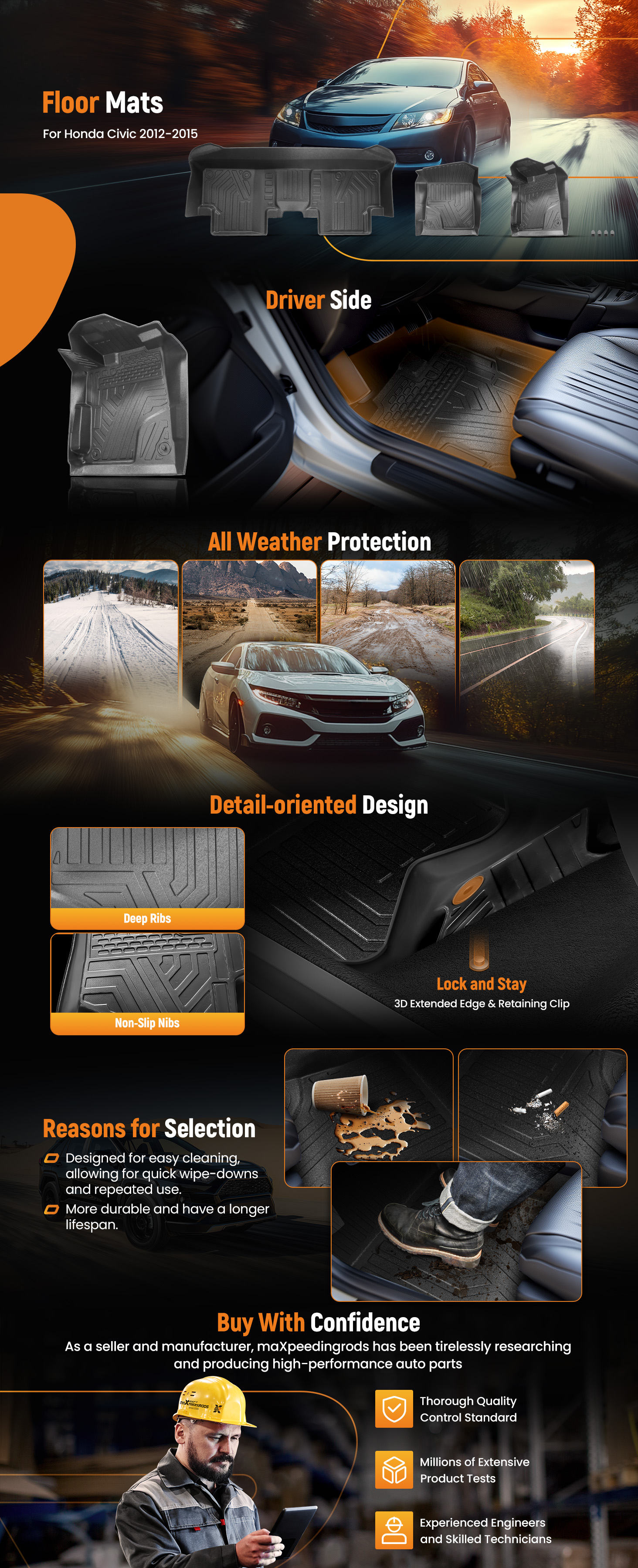 - All-weather protection, Unique designed channels and raised edges can effectively trap the liquid, snow, sand, etc.