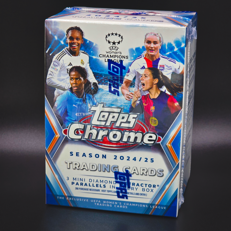 This listing is for one (1) factory‑sealed 2024‑25 Topps Chrome Women’s Champions League Value Blaster Box. Each blaster contains 7 packs with 4 cards per pack, including 3 guaranteed mini diamond refactor parallels. Stored in a smoke‑free, climate‑controlled environment.
