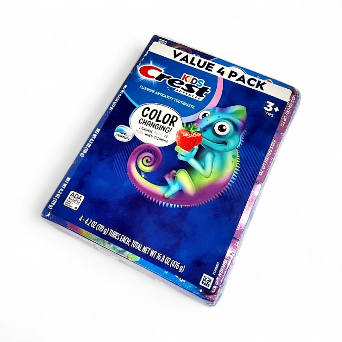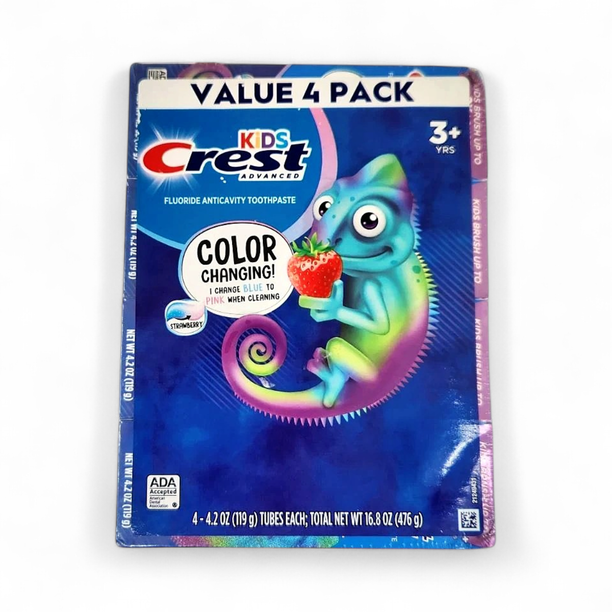 This listing is for a 4-pack of Crest Kid's Advanced Color Changing Toothpaste, featuring a delightful Strawberry flavor. Each tube contains 4.2 oz of toothpaste, designed to make brushing fun and effective for children.