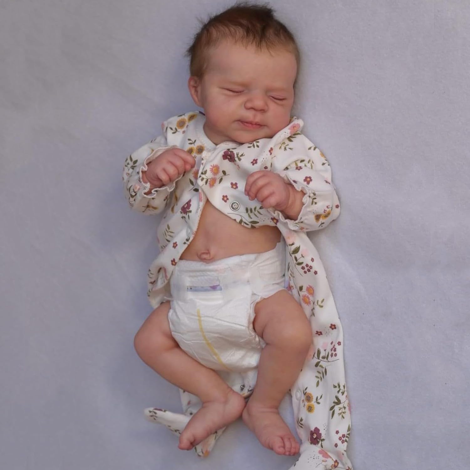 Size: About 18 inch 45 cm from the head to the toe,about 2.2 lbs Matierial :This newborn baby doll is full body soft vinyl ,with boy gender parts Eyes:Baby reborn dolls with eyes closed ,can not blink Hair:Hand rooted hair Clothes:The same as the pics shown