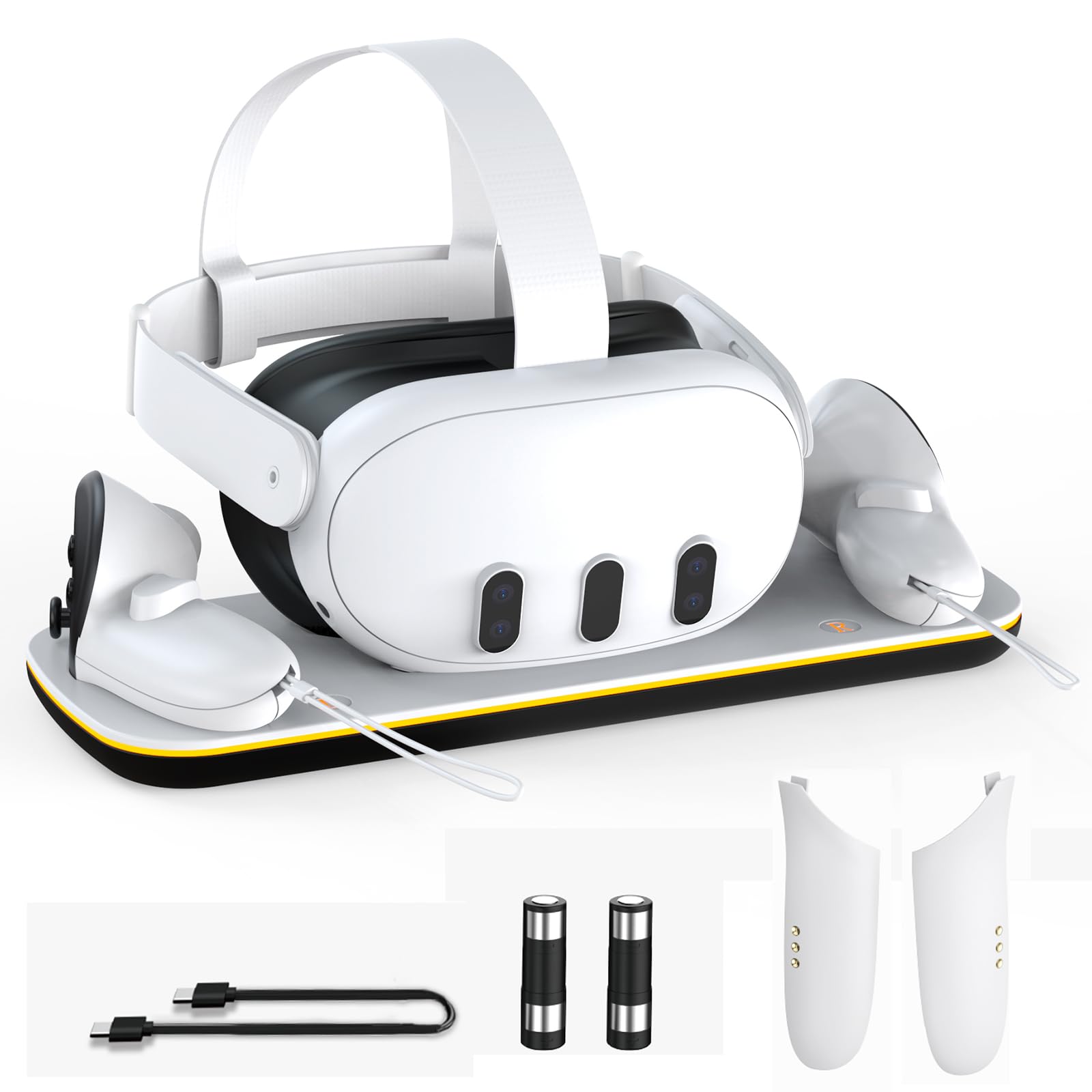 • [ Easy to Install ] - Simply place the vr headset and replace the batteries and the batteries covers of the controller, then align the corresponding gold contacts for fast charging, which makes it easier and faster to charge without the hassle of plugging in tons of charging cables and frequently replacing the controller cover.