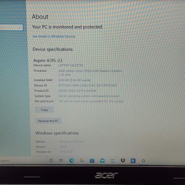 This Acer Aspire 3 (A315-23) Series laptop offers a practical everyday computing setup with an AMD Athlon Silver 3050U processor, 8 GB of memory, and a 128 GB SSD. It comes in a gray finish and runs Windows 10 Home.