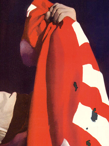 holding a torn Japanese flag and a rifle with a bayonette. The
