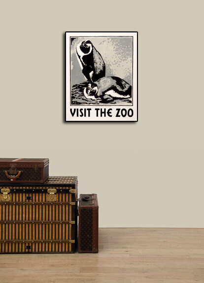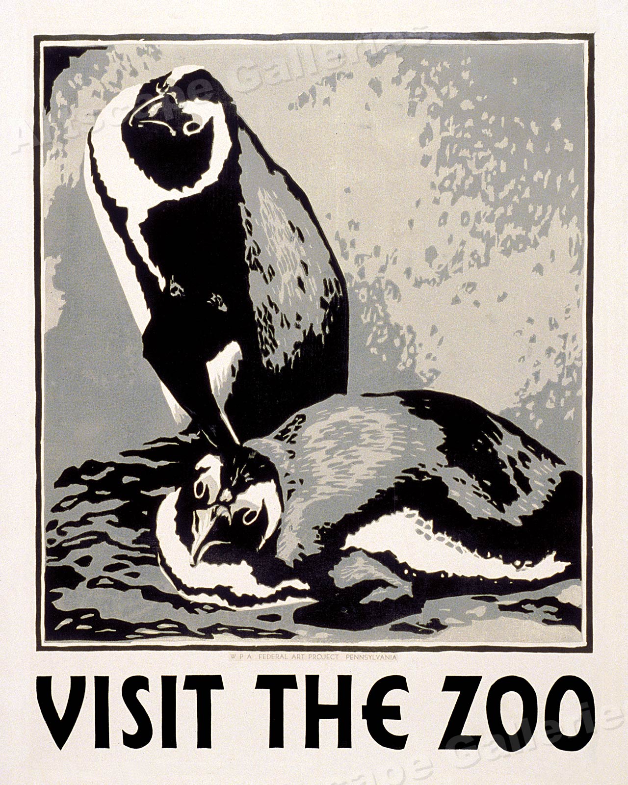 This is a Classic WPA (Works Project Administration) Advertising Poster originally published around 1936. This Poster promotes the zoo as a place to visit, showing two penguins.