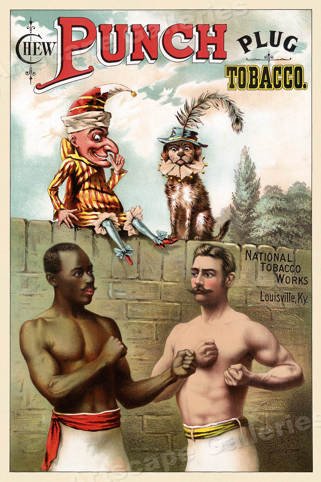 This great Vintage Style Advertising Poster shows two men in a pugilistic pose, a punchinello clown and a dog wearing a hat and collar sitting on a wall.