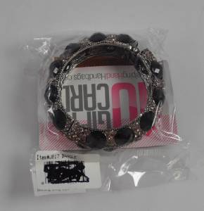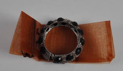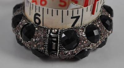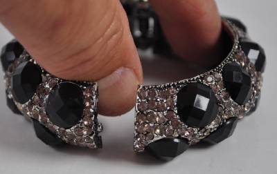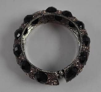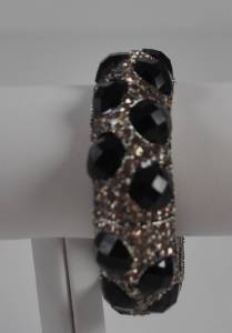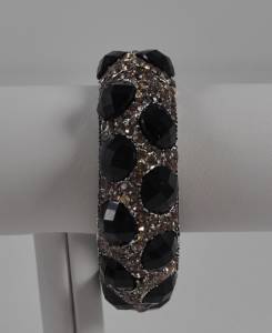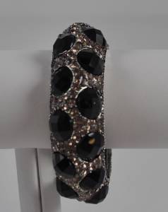 This is a silver tone and oxidized colored bangle or cuff bracelet with black and clear faceted rhinestone trim or design. It comes with a storage bag and is hinged for ease and comfort in wearing. This bracelet will make any day feel like a special occasion.