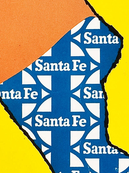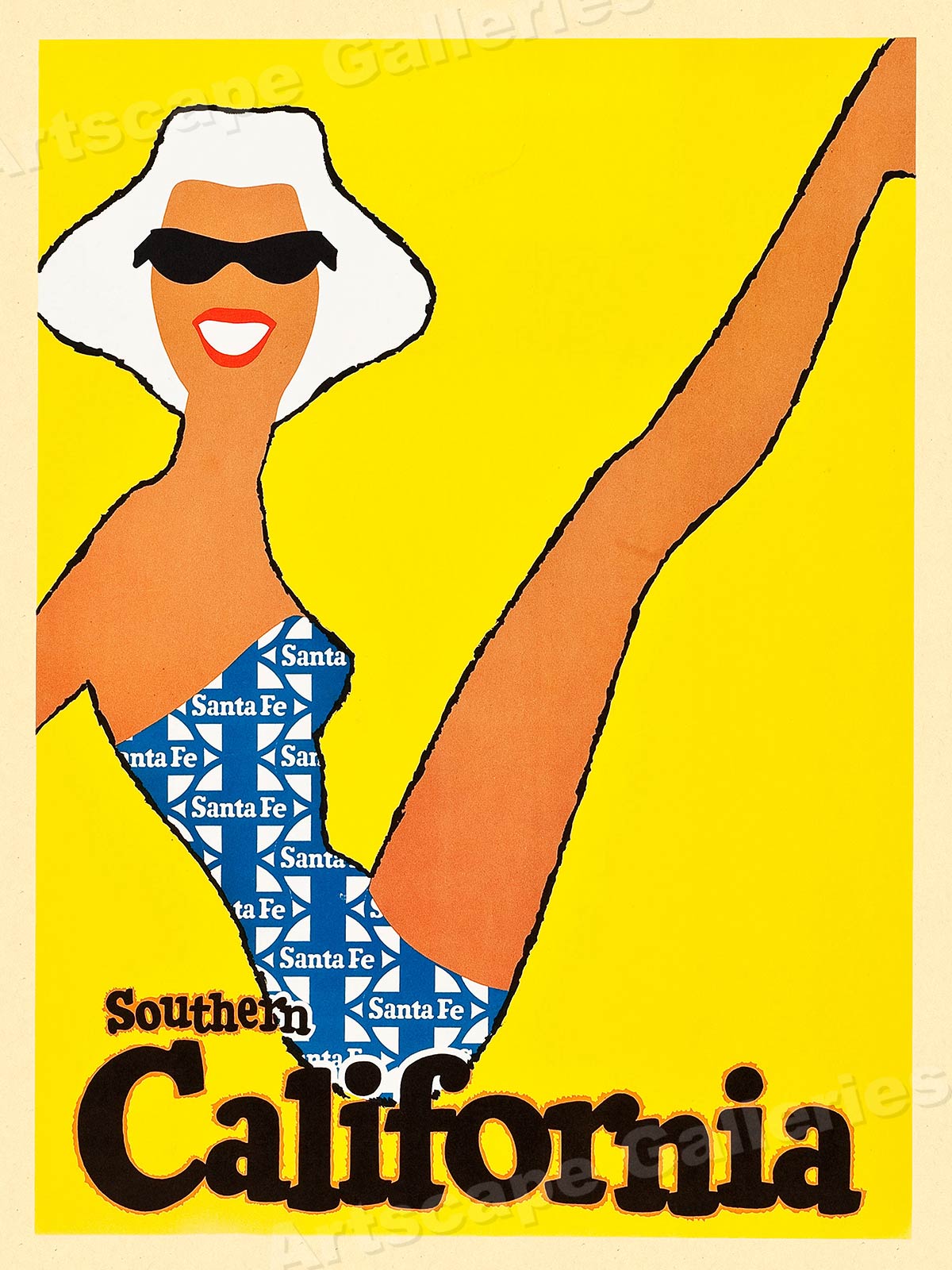 This great Vintage Style Santa Fe Railroad Poster shows a drawing of a girl with tan legs and sunglasses.