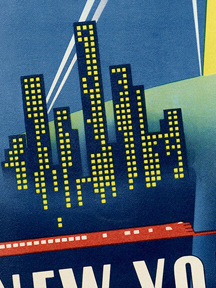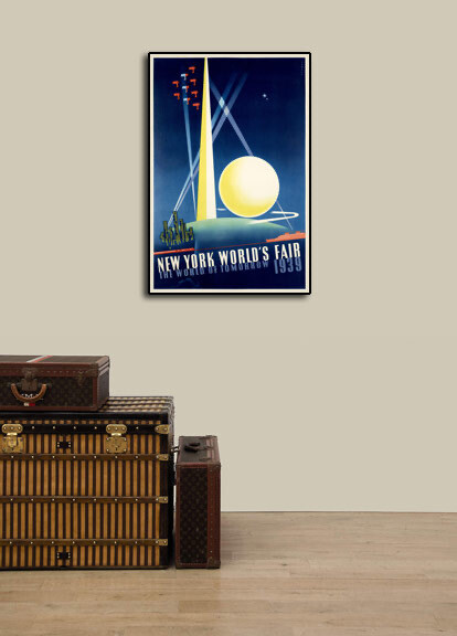 This great Vintage Style Travel Poster shows the Trylon and Perisphere, two monumental modernistic structures designed by architects Wallace Harrison and J. Andre Fouilhoux that were together known as the "Theme Center" of the 1939 New York World's Fair.