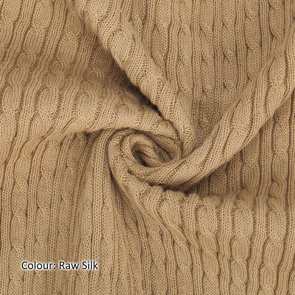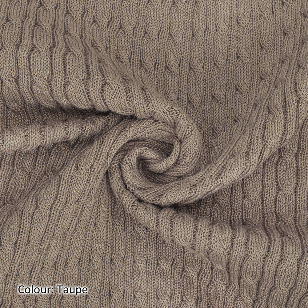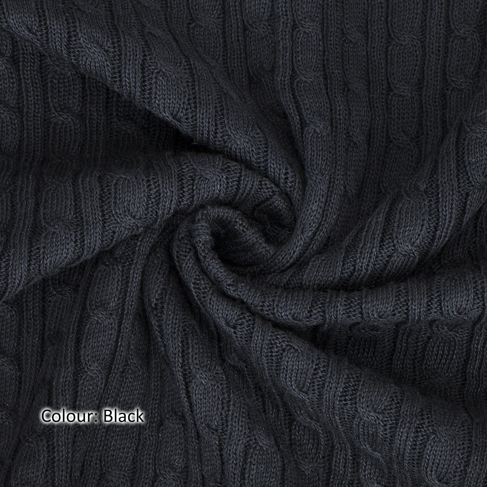 50-55cms Relaxed Width, Stretched to double with width! Twist Cable Knit Fabric in 14 Colours. Cotton Feel Matt Polyester Composition.