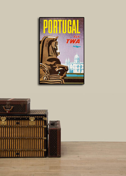 This great Vintage Style Travel Poster shows a statue of a horse with the royal palace in the background. The caption reads: "Portugal - Fly TWA".