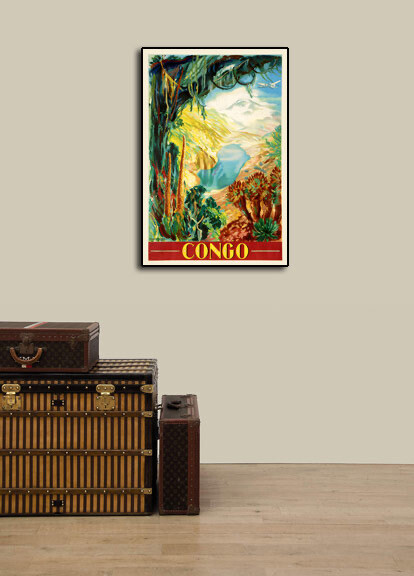 This great Vintage Style Travel Poster shows a jungle scene peering into a valley with a lake. The poster