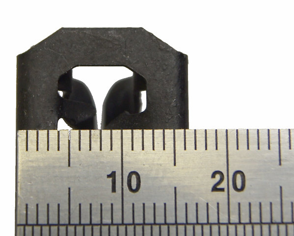 Click Thumbnails to EnlargeThis is a pack of 6 metal clips to hold interior trim pieces in place. You will receive 6 clips per order. Each clip is 25MM long, 17MM wide, and 15MM thick. The center opening measures 17MM long and 8MM wide to grab onto many different size tabs. You would press this onto a interior trim tab, and then push this metal clip into another trim or hole to hold that trim piece in place. A perfect example of this is the door opening floor trim panel. These can be used in many other applications other than the automotive industry. Can be used in home, office, marine, hobby, or industrial applications.