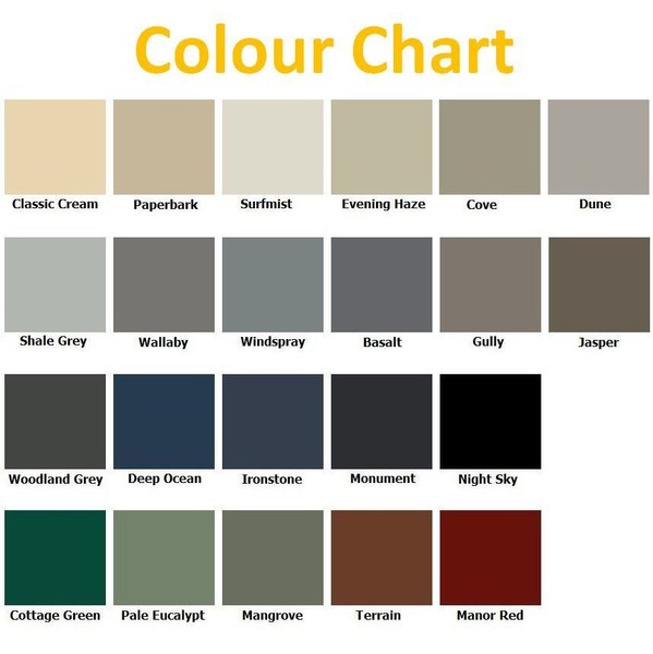 - Colour: Any colour* (refer to colour chart above)
