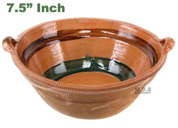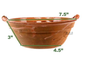 Barro literally means "mud" but generally means "clay," This beautifully hand-crafted and hand-painted Barro Cazuela is made by artisans living in the Oaxacan highlands. The red clay is gathered from the surrounding hills. Bits of wood, stone and corn are used as tools to mould the clay on a traditional banding wheel. The pottery is burnished using a stone and brush to give it a smooth unglazed finish. Finally it is pit fired under corrugated metal with wood, sawdust and cardboard. Made of earthenware or "clay" or in Spanish “Barro" this Cazuela is authentic and a piece of fine art. Barro maybe glazed inside or out (or both) then fired over low heat. The results are earthy, stunning and a pleasure to use. Clay has been traditionally used in Mexican cooking because the clay imparts a specific flavor to the foods that can't be reproduced in a metal pot. Before use, be sure to cure by using a simple seasoning process before you use this Cazuela. Fill with water and place it over a direct flame. Allow the water to boil for a few minutes then remove from the heat and discard. Do this twice. Add a bit of Mexican pottery to your table with this gorgeous handmade Cazuela De Barro piece. They are beautifully hand painted with stripes along the inside and the special and authentic hand shaping of the Barro makes them unique in proportion, an element that makes handmade so beautifully perfect. Excellent for Casseroles, Frys, Braising, Roasts.And Convenient and Versatile for cooking in the oven, stovetop or outdoor use. There are no breaks, but please keep in mind that this clay material is hand handled, shaped and made; minimal chipping is natural. They are ready for use and certainly to add a bit of Mexican style decor to any table setting or folk kitchen. With this product you aren’t just buying a dish but rather a piece of Artistry. Barro Cazuela is 3 inches in Height, and 7.5 inches in diameter at the top with a bottom diameter of 4.5 inches.