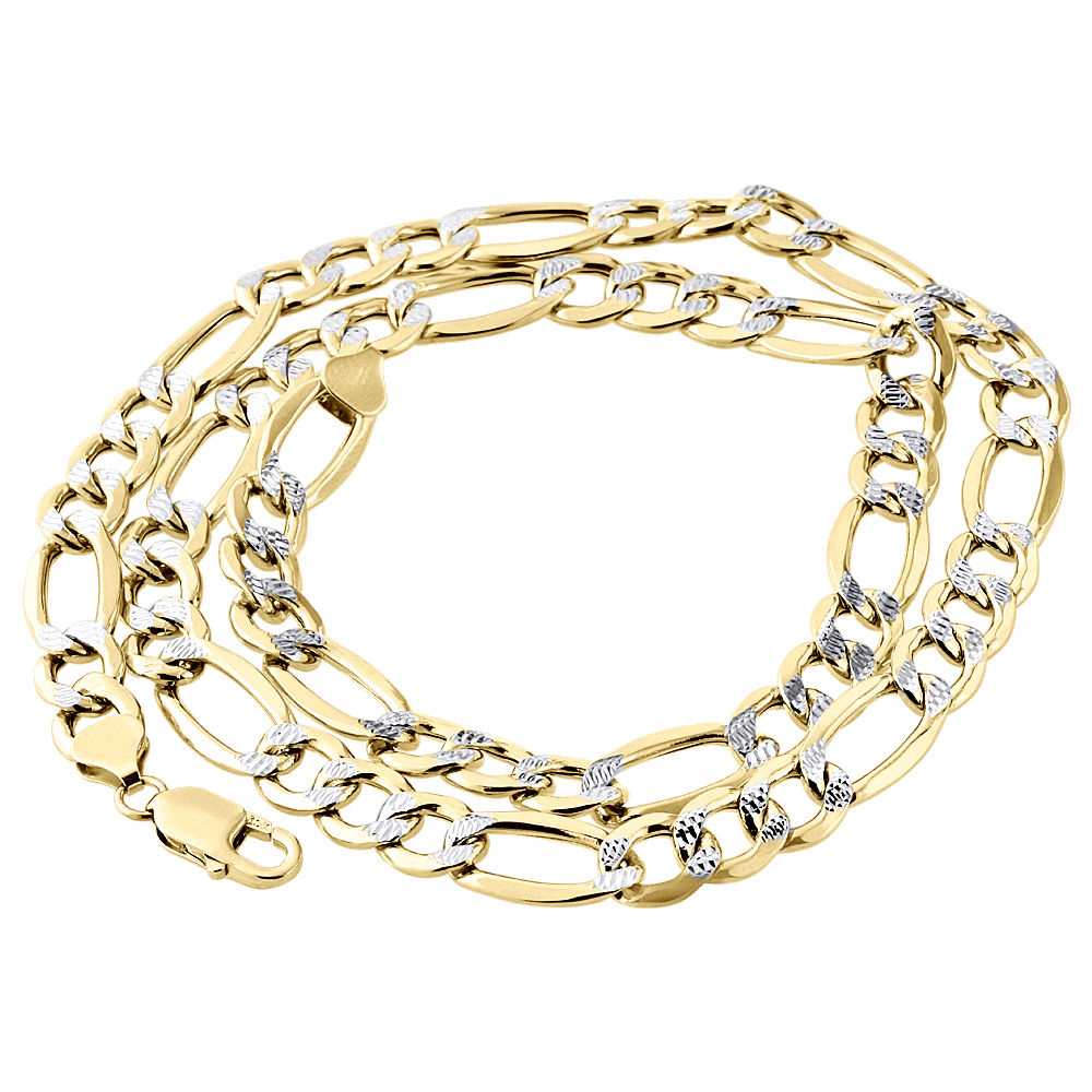 This real Yellow Gold Diamond Cut Hollow Figaro Link chain is presented inlustrous 10K Gold, finished with a professional bright high polish for extra shine and luster. This chain is 9.50mm wide and is available in different lengths. This chain comes in 20, 22, 24, 26, 28 & 30 inches (check drop down to see which lengths are available in stock). The starting weight is approximately 27.2 grams for 20" necklace. This chain is ideal for wearing with a pendant or wide enough to wear by itself. The chain has a secure Lobster Clasp so it is easy to put on and take off.