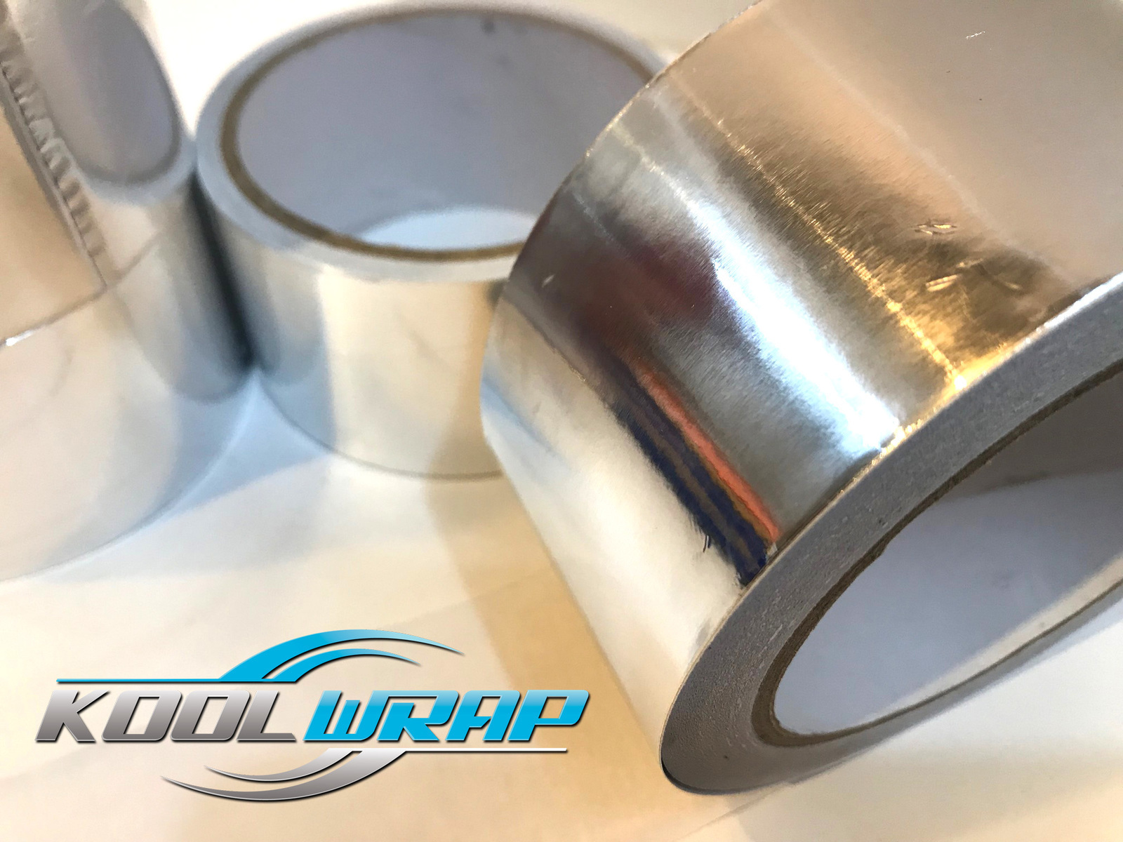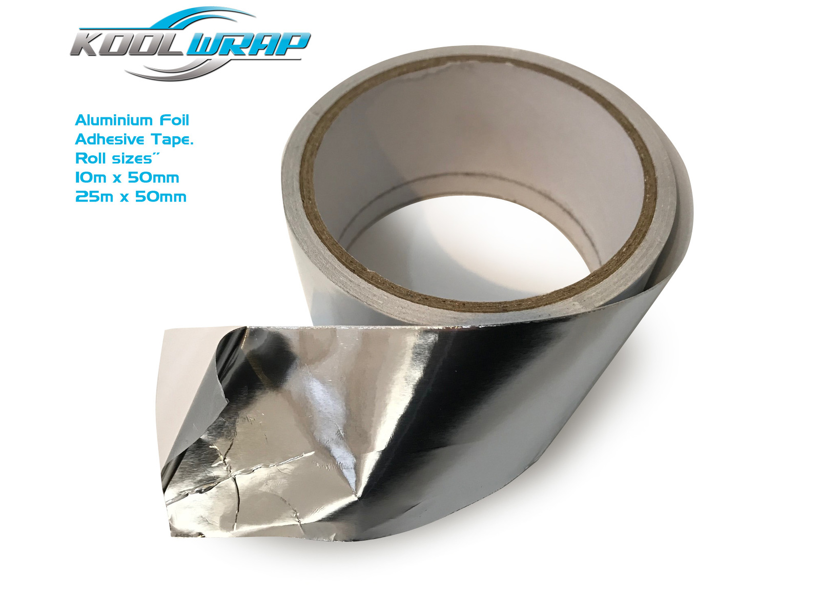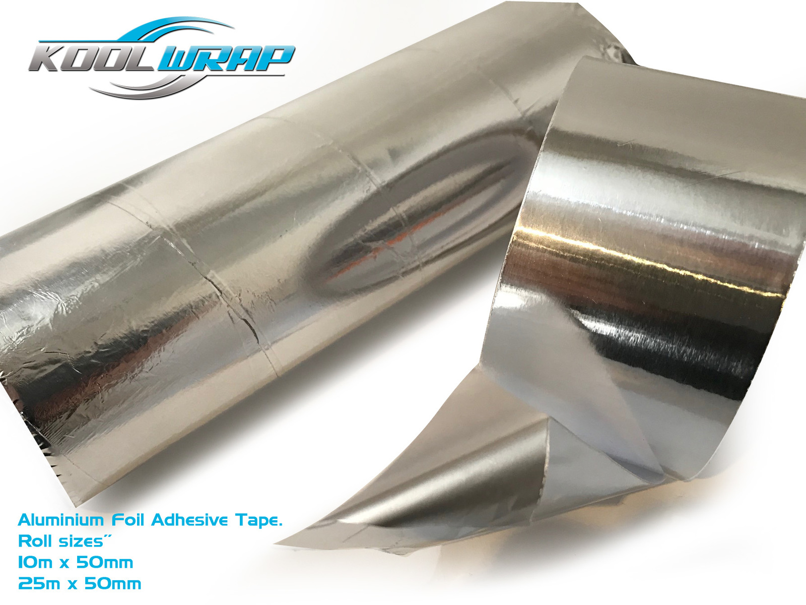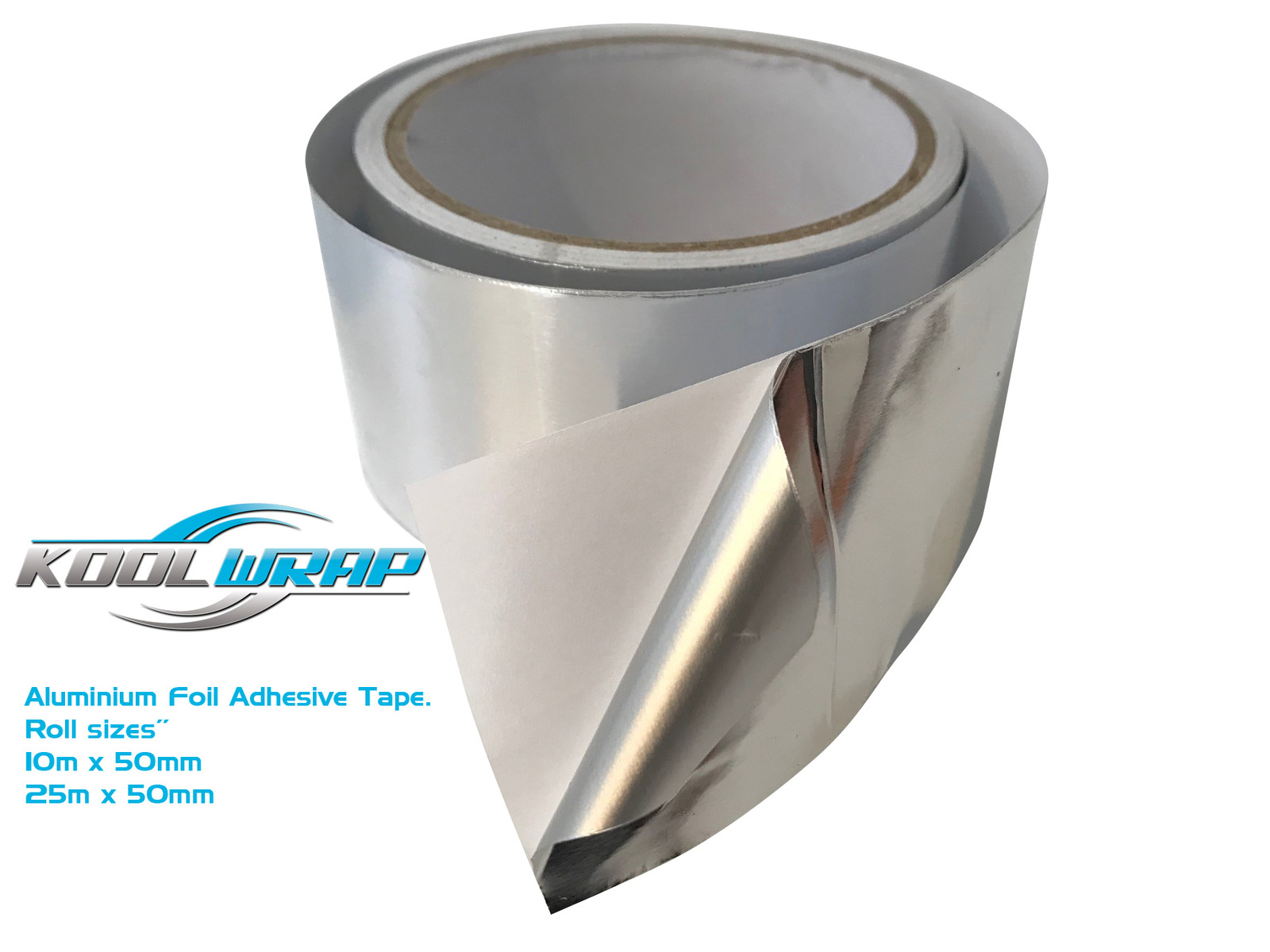 Silver Aluminium Foil Heat Reflective Adhesive Duct Tape 50m long x 50mm wide Silver Aluminium Hi Temp Heat Reflective Adhesive Tape - Heavy Duty 70um or 0.070mm 3+ times thicker than normal domestic aluminium foil Kool Wraps latest heat reflective silver foil tape. The Kool Wrap Adhesive Tape can be used to reflect heat away from: Air intake tubing Any type of ducting including air conditioning ducts Air boxes Engine bay firewalls Engine covers and anywhere where heat could cause damage. Silver Wrap can withstand up to 650°C in radiated heat. It can easily be cut to size with scissors . We also stock a wide range of both silver and gold reflective tapes incuding fibreglass reinforced and insulated tapes. Other sizes includes: Silver Foil Tape 10m x 50mm x 30um adhesive ta| SKU | KW0510 |