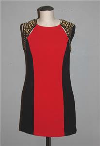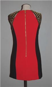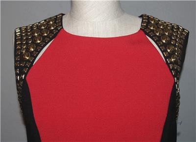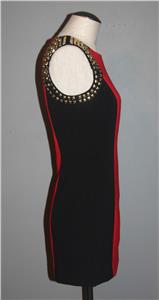 Michael Kors Deep Red & Black Vertical Color Block Stripes Lined Sleeveless Dress. Zipper back. Large round and square gold studs on shoulders and around armpits. Vertical holes-openings on front and back of shoulders. Light scuffs on a few studs. Dry clean, 67% polyester, 29% rayon, 4% spandex, lining is 97% polyester, 3% spandex. Women's Size 2. Approx. measurements: