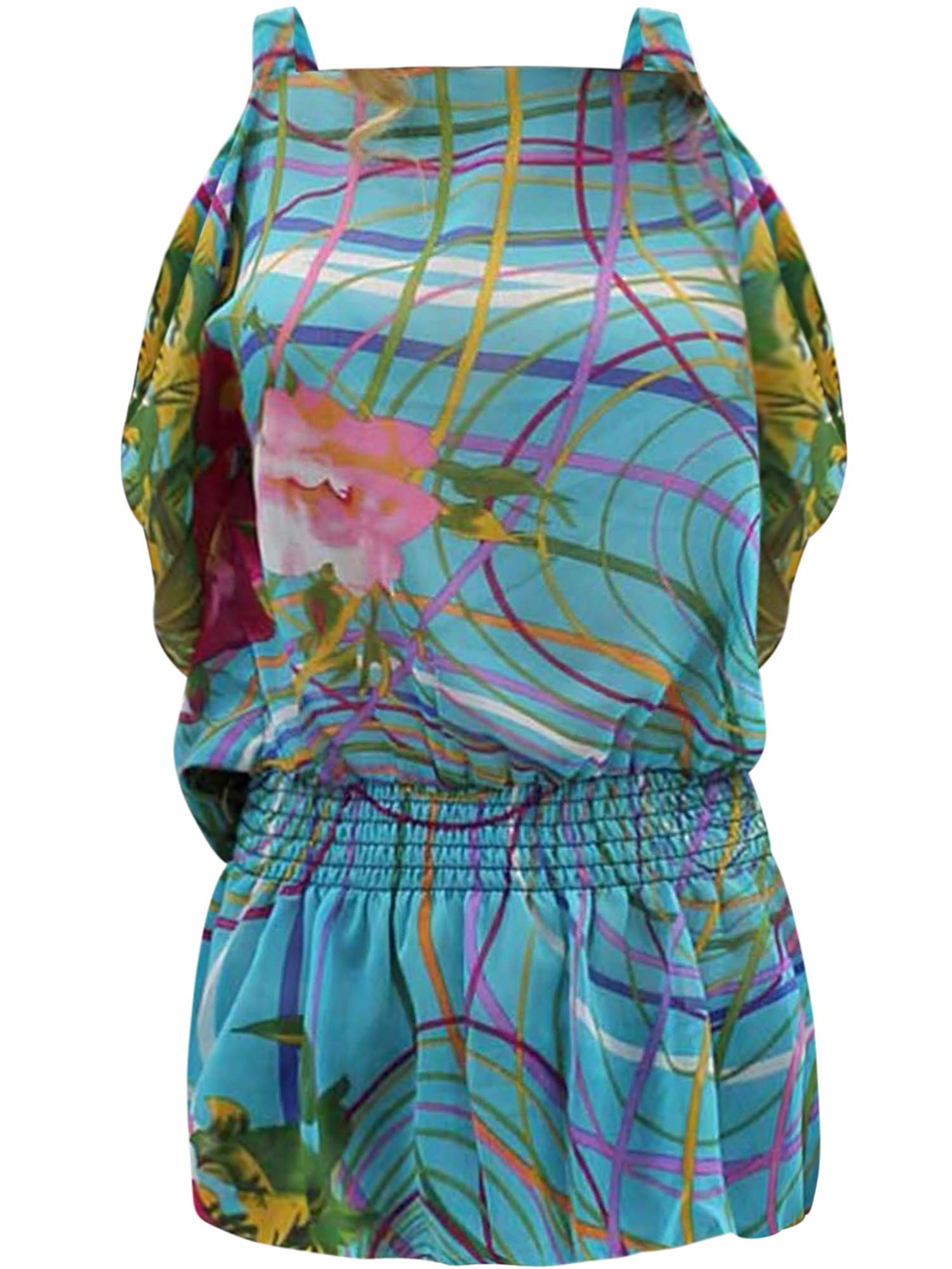 Pair this jewel print cold shoulder blouse with your favorite mini skirt to create a head turning outfit.