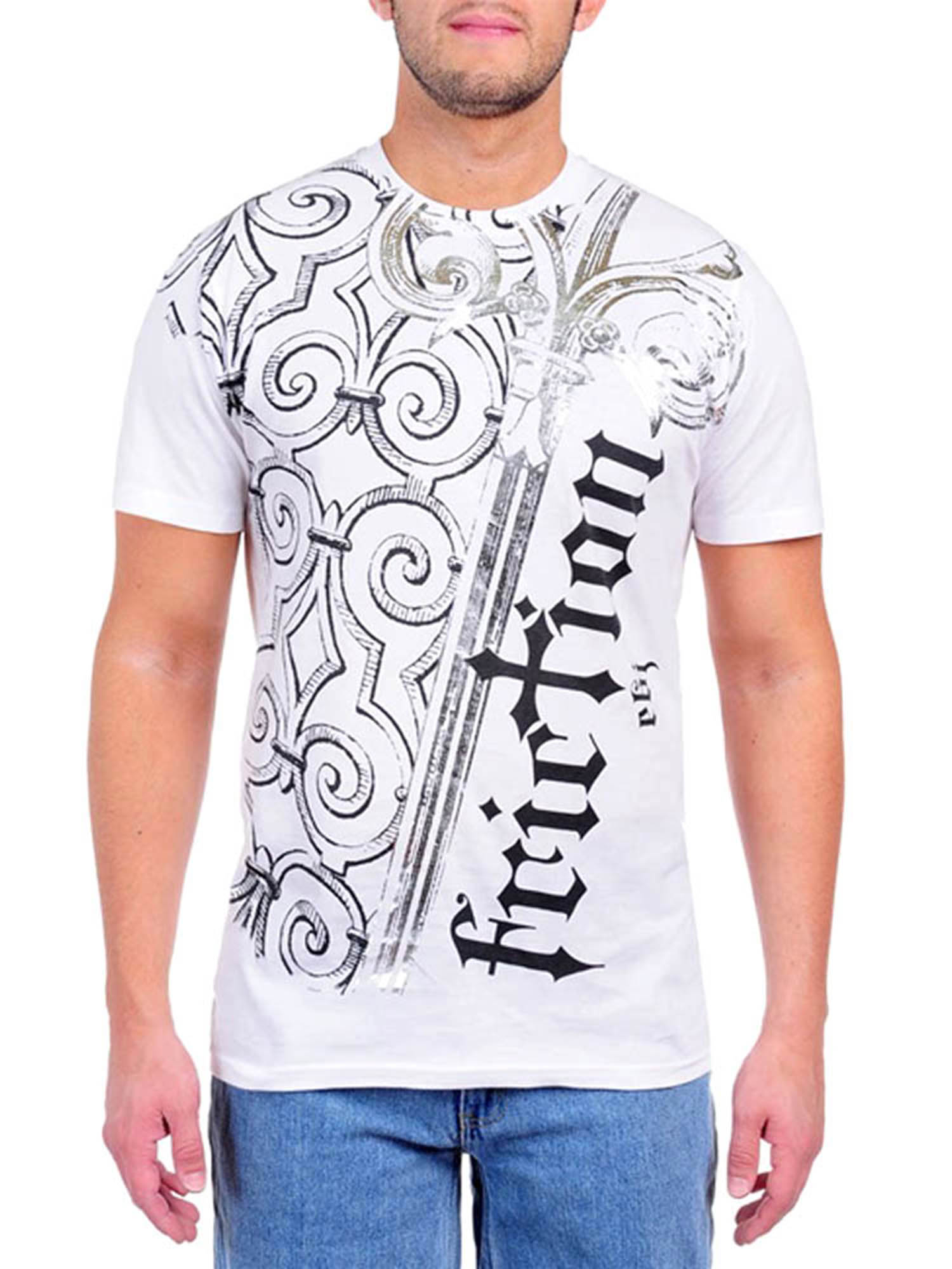 The foiled graphic design on this mens t-shirt runs from the top of the tee to the bottom.