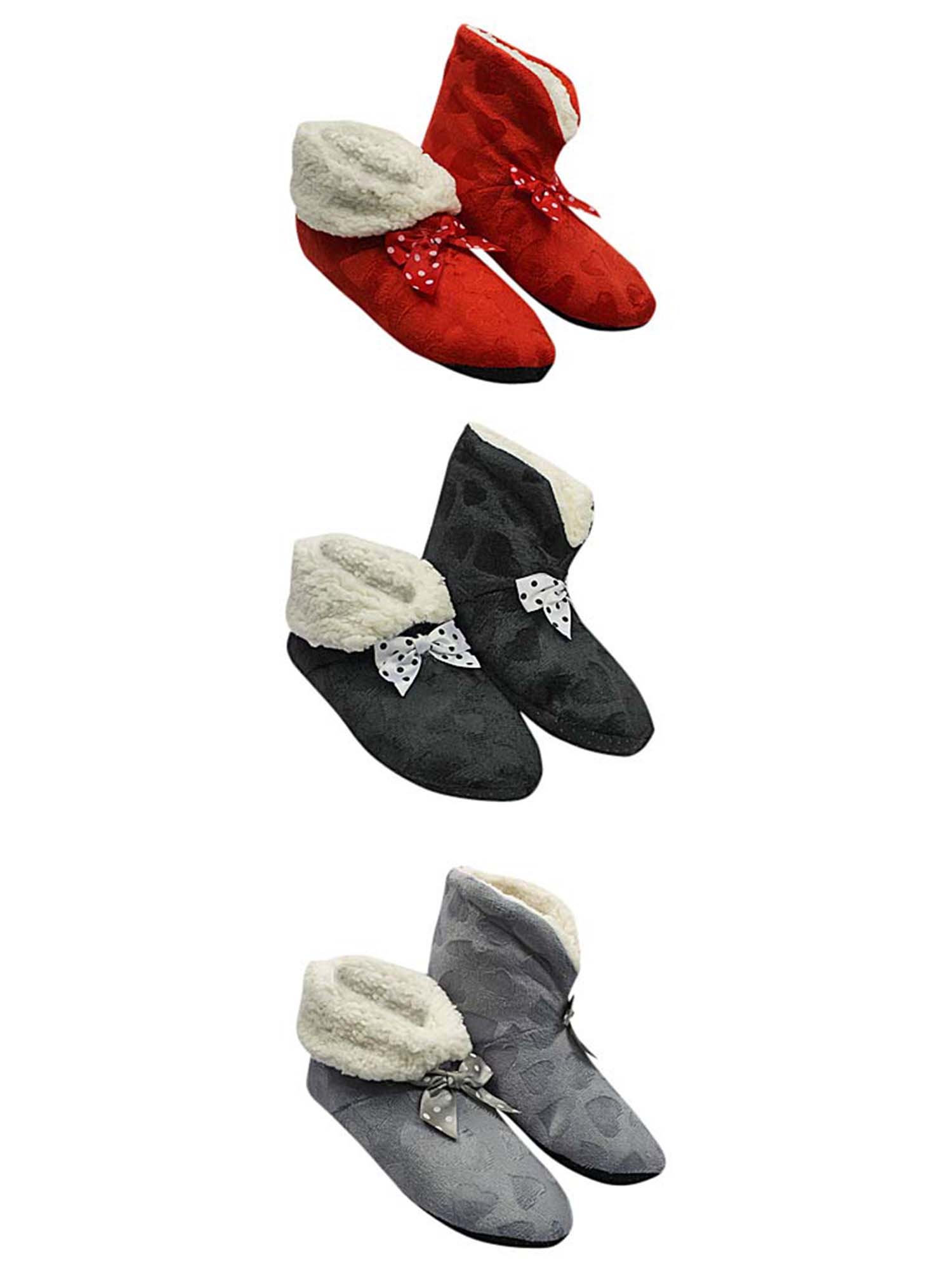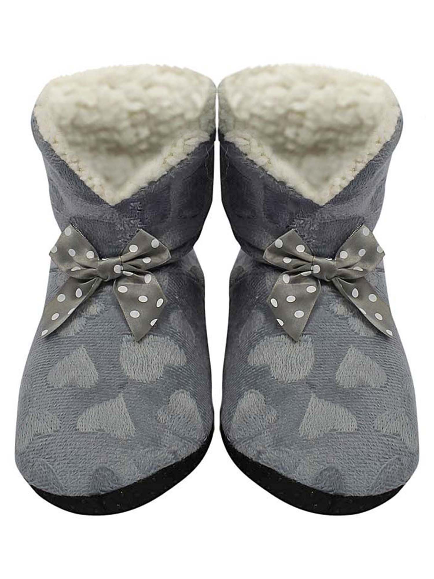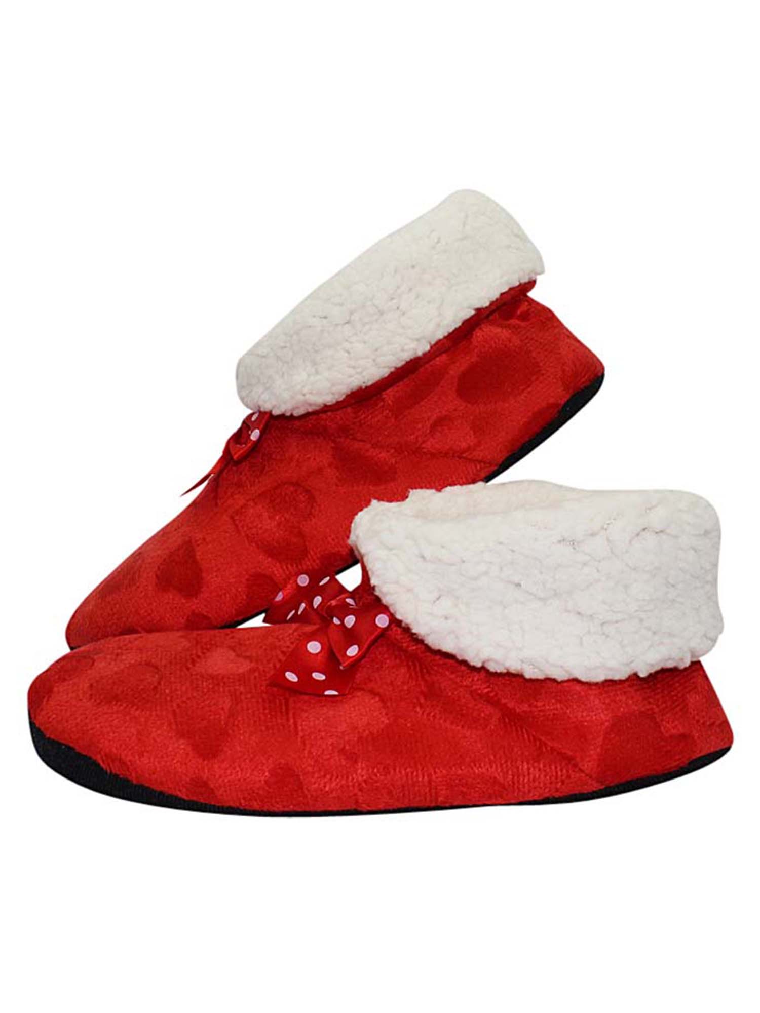 Slippers are adorned with a pretty polka dot satin bow.