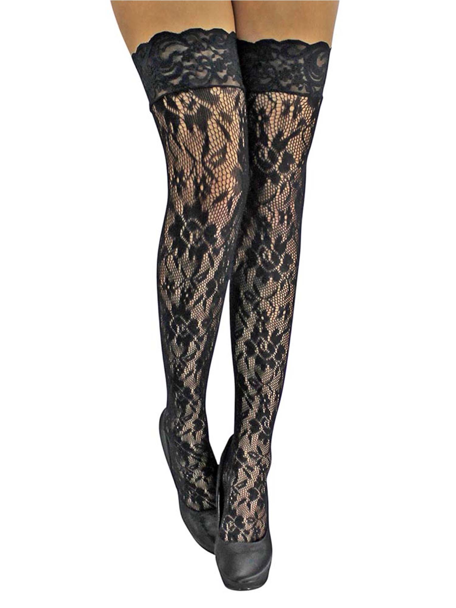 These sexy thigh high stockings feature a fishnet-like weave with additional floral detail and a lace top garter band to hold them in place.
