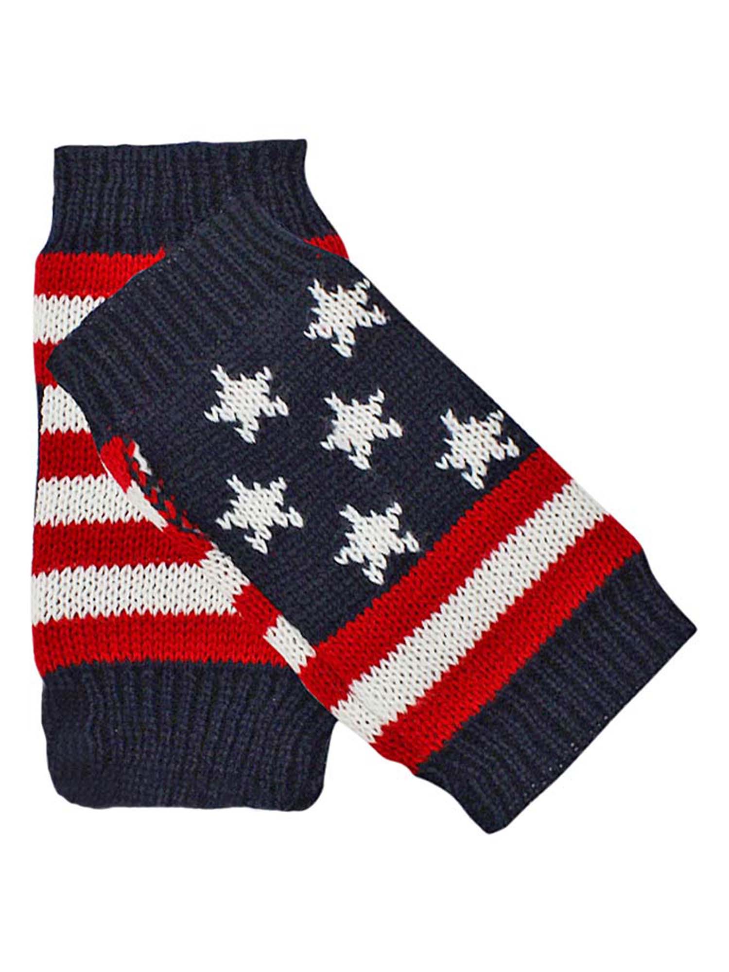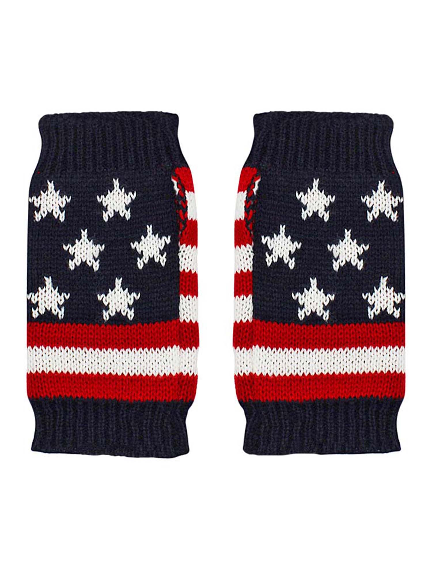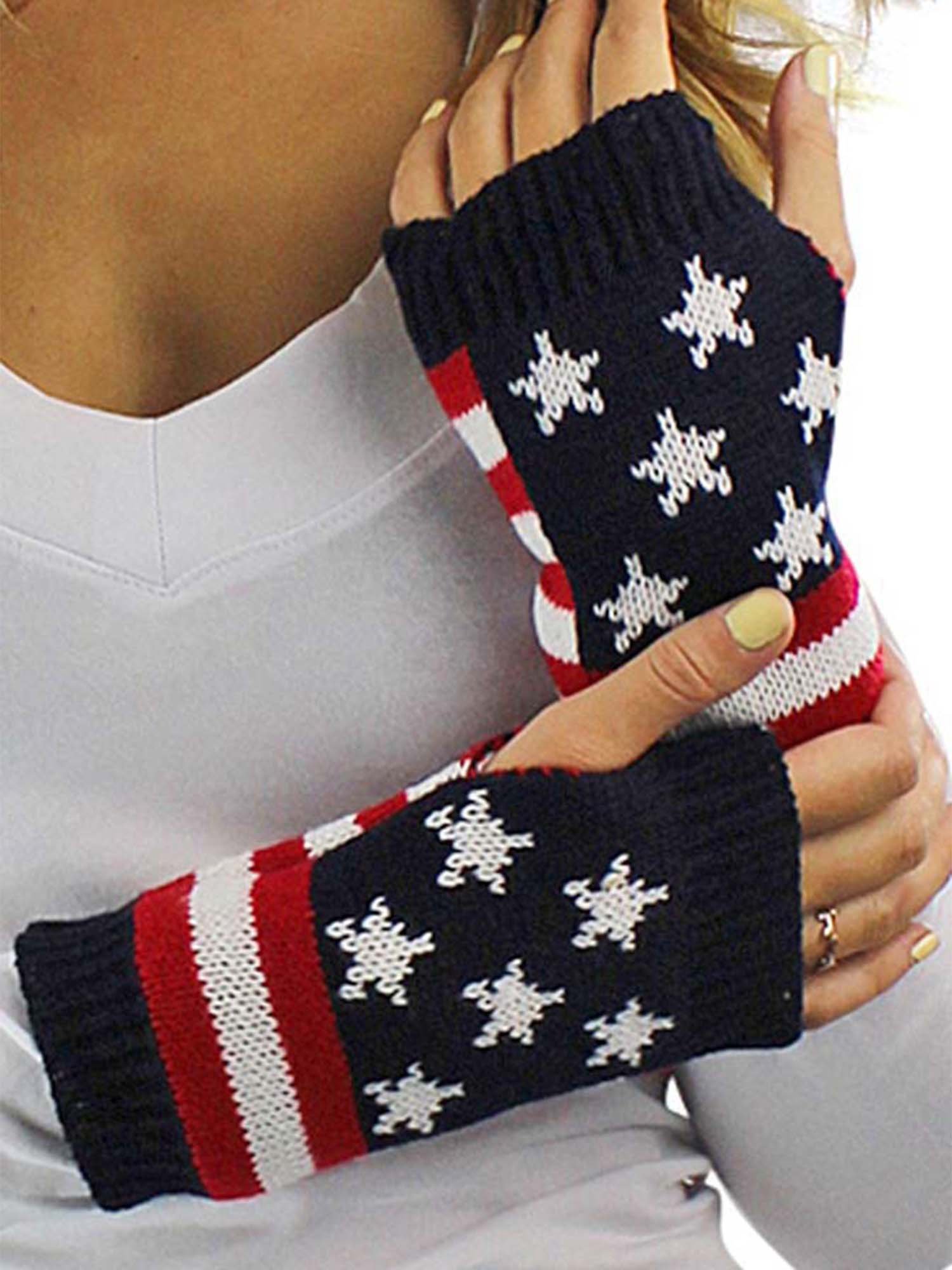 Classic starred and striped design, these fingerless gloves have a thumb hole, and cover the hand up to the wrist.