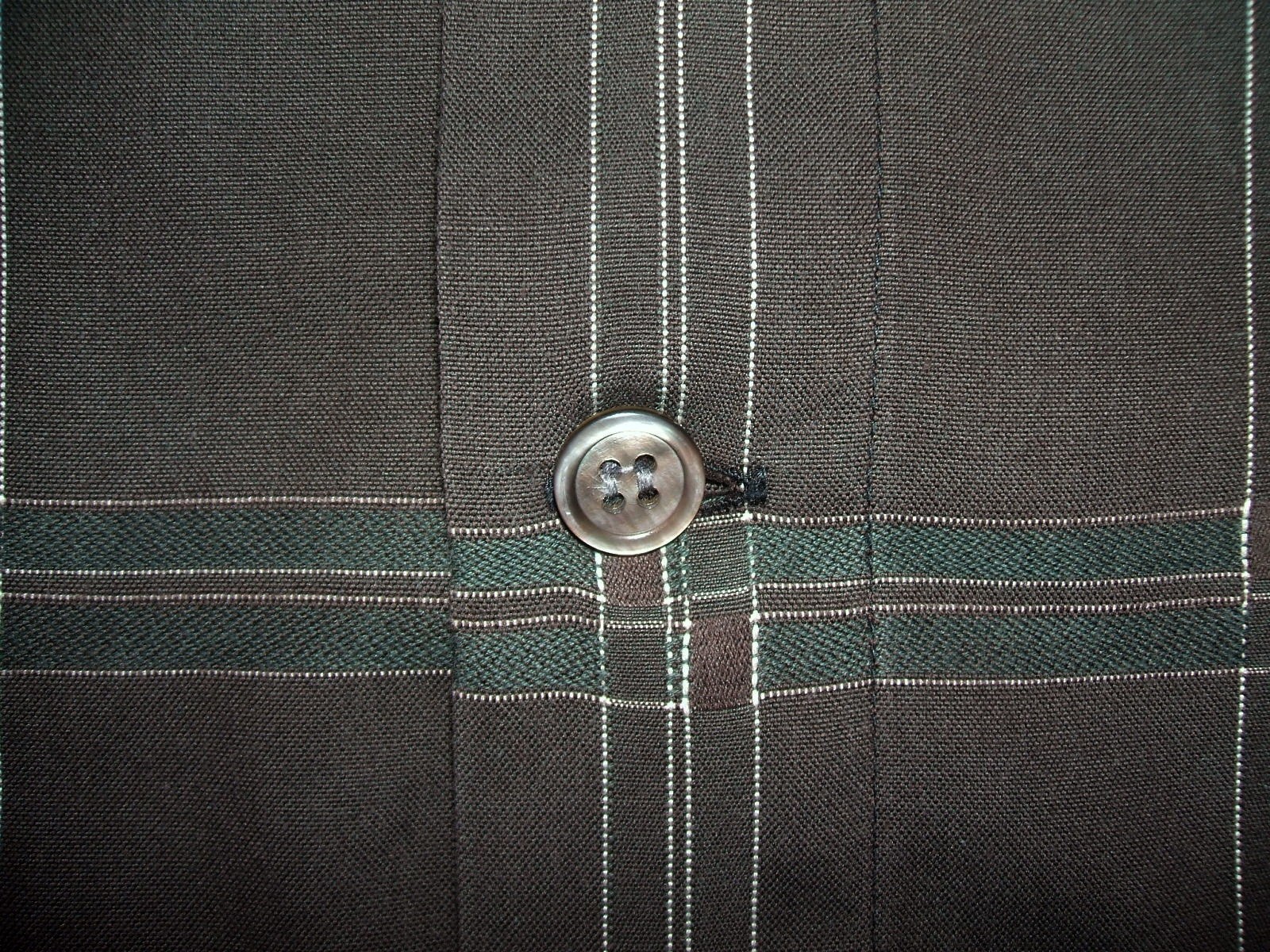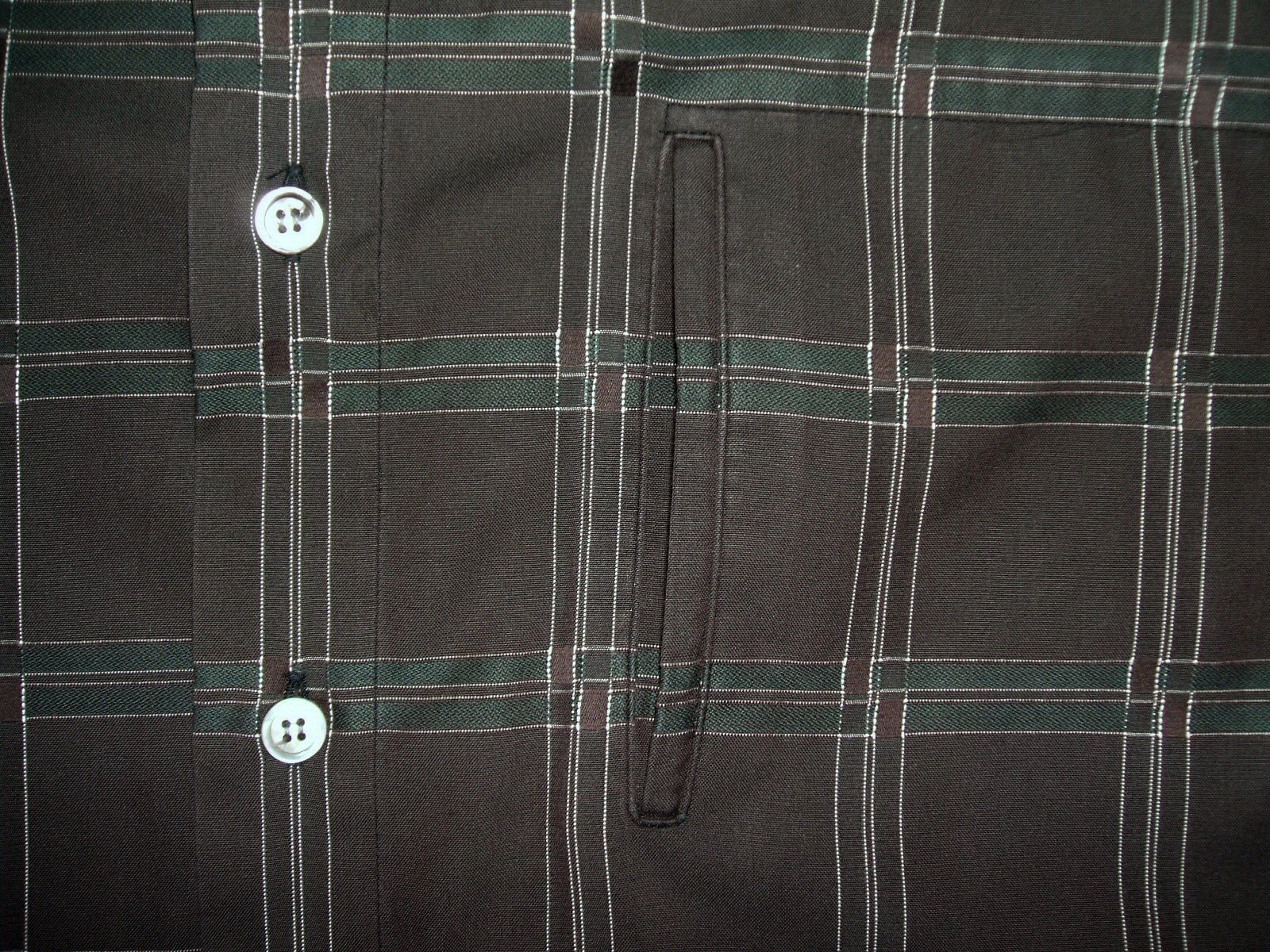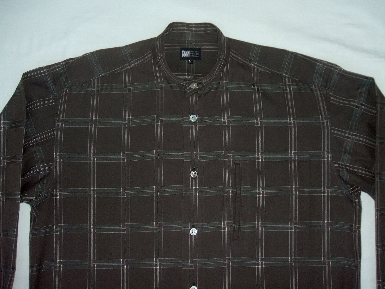 Excellent vintage 90's ISSEY MIYAKE DESIGN STUDIO collarless brown plaid men's shirt long sleeves with buttons front authenticity guaranteed. Check out cool designer shirt. The shirt has collarless, single hidden chest pocket on left with 7 mother of pearl buttons closure on front, straight hem and slit at sides. The color is brown, white, green with plaid pattern. Fabric is 100% cotton. The item is pre-owned still in excellent condition, no holes, tears, stains. It has been laundered clean and fresh ready to wear. Don't miss out cool and awesome shirt.
