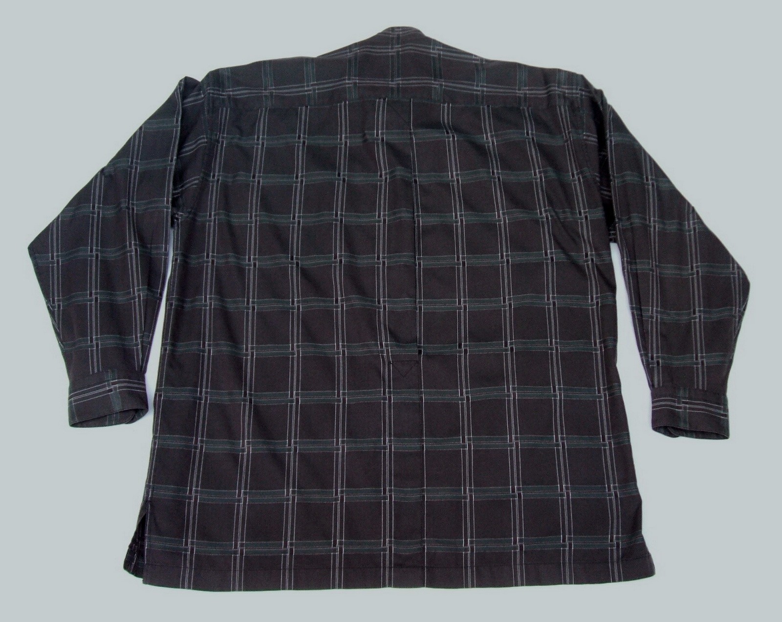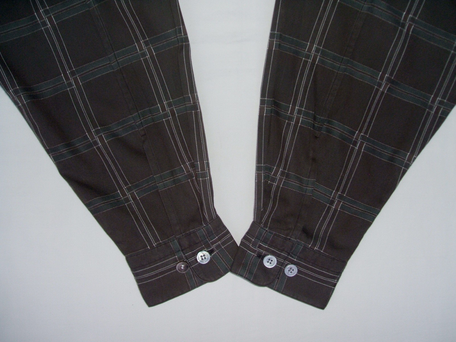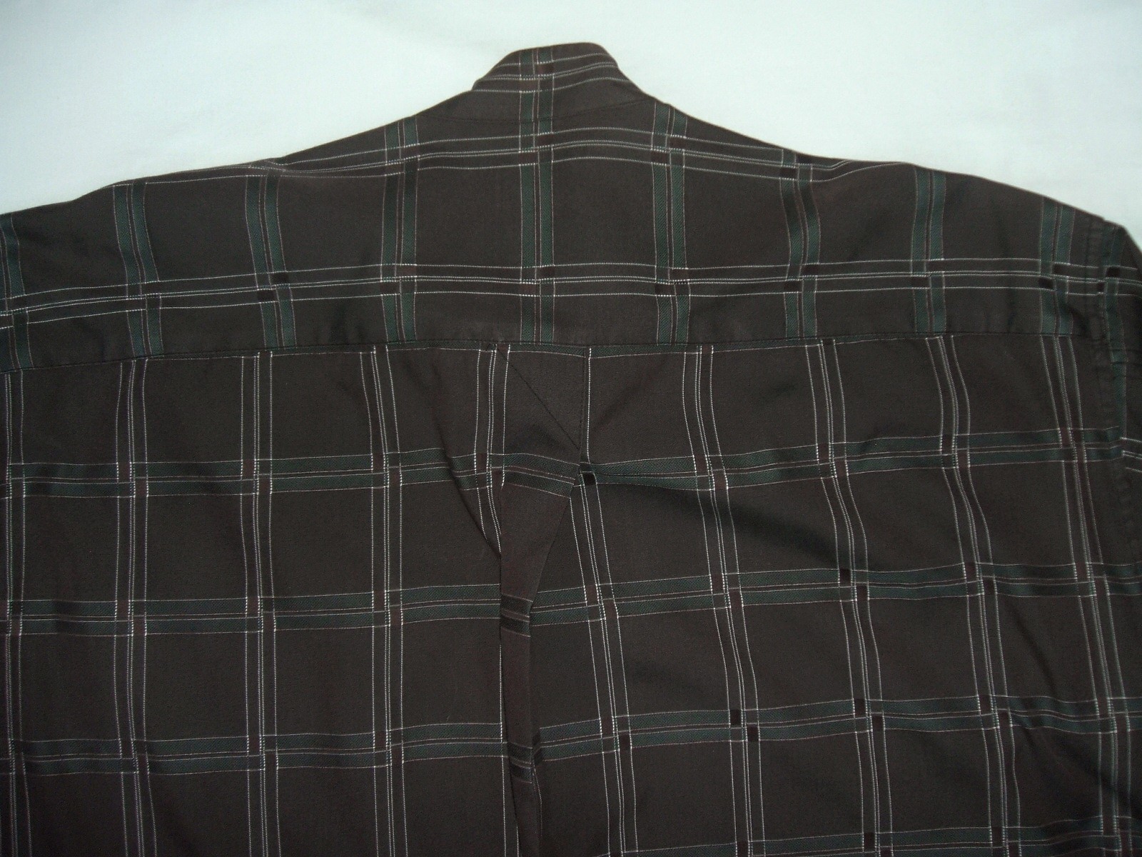 Excellent vintage 90's ISSEY MIYAKE DESIGN STUDIO collarless brown plaid men's shirt long sleeves with buttons front authenticity guaranteed. Check out cool designer shirt. The shirt has collarless, single hidden chest pocket on left with 7 mother of pearl buttons closure on front, straight hem and slit at sides. The color is brown, white, green with plaid pattern. Fabric is 100% cotton. The item is pre-owned still in excellent condition, no holes, tears, stains. It has been laundered clean and fresh ready to wear. Don't miss out cool and awesome shirt.