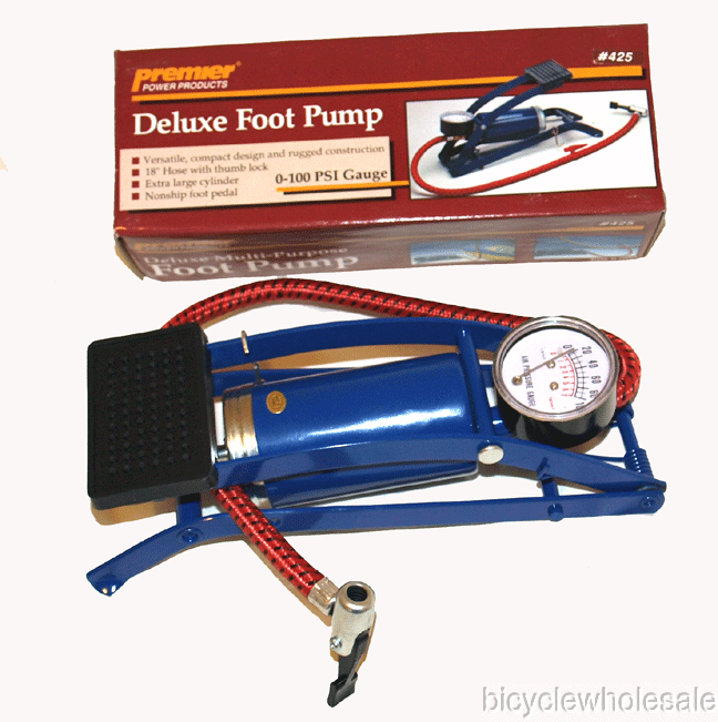 This high pressure pump is operated by you foot, not electric needed. It inflates up to 100 pounds per square inch pressure. It is perfect for bicycles tires, inflating toys and athletic equipment, lawn equipment tires. It is compact with a extra large cylinder and a 18" hose with a standard schrader thumb lock on it. (automotive style valve)