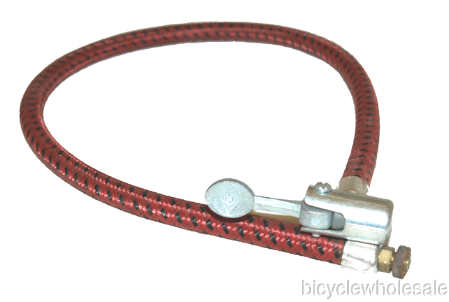 Bicycle Pump Hose Schrader 24" Steel Thumb Lock Hose. This is a replacement hose for most bicycle floor pumps. The hose screws onto the bicycle pump and has a steel thumb lock valve adapter for schrader valve tubes. The hose is 24" long with 3/16" diameter thread & 1/16" thick tubing air hole. This replacement hose is brand new. See photo for listing contents.