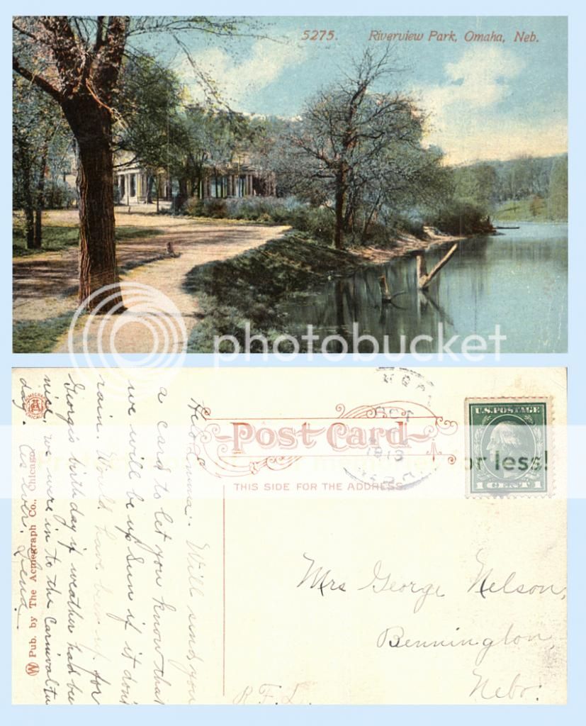This auction is for a nice divided postcard showing The Riverview Park, Omaha, Nebraska - Wonderful 1913 dated image; wonder what the area looks like now? - Published by Acmegraph, #5275. Great vintage litho card - FREE shipping for this card.