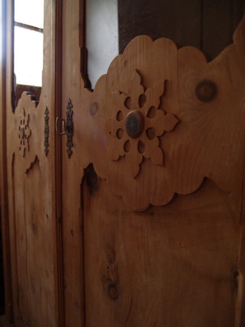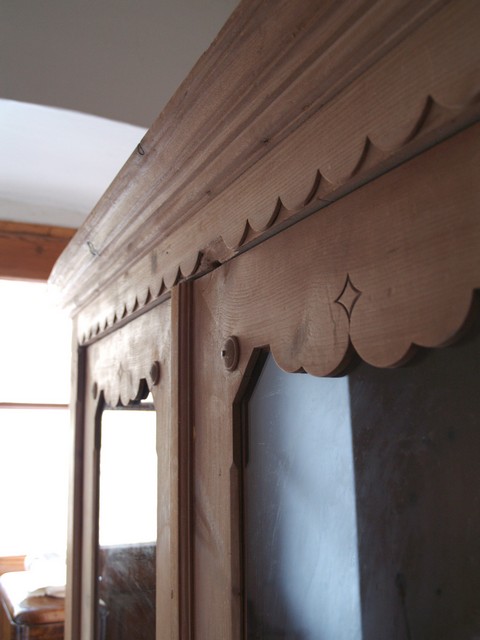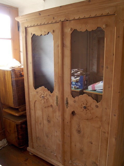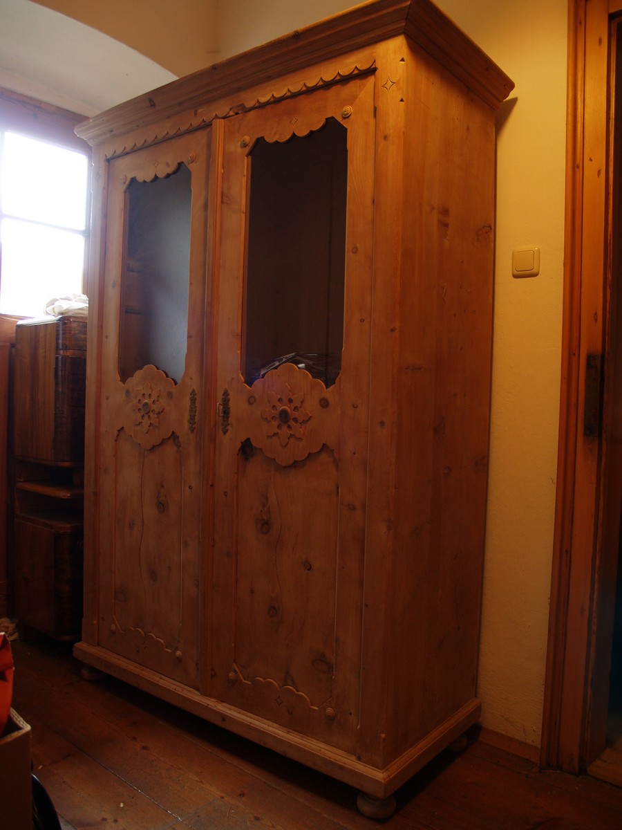 Dieser Schrank zeigt an der Außenseite eine für die Zeit typische Gestaltung. So befinden sich an den Türen hübsche Ornamente und am Oberbereich der Türen, je eine Glasfüllung.