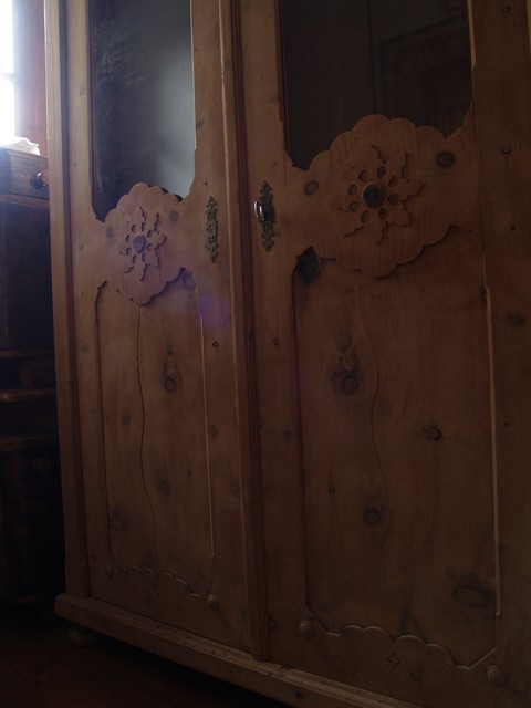 Optisch zeigt der Schrank reiche ornamentale Schnörksel und an den Türel florale Medaillons. Der Originalschlüssel kam abhanden - es wurde jedoch ein anderer, passender Schlüssel aufgetrieben.