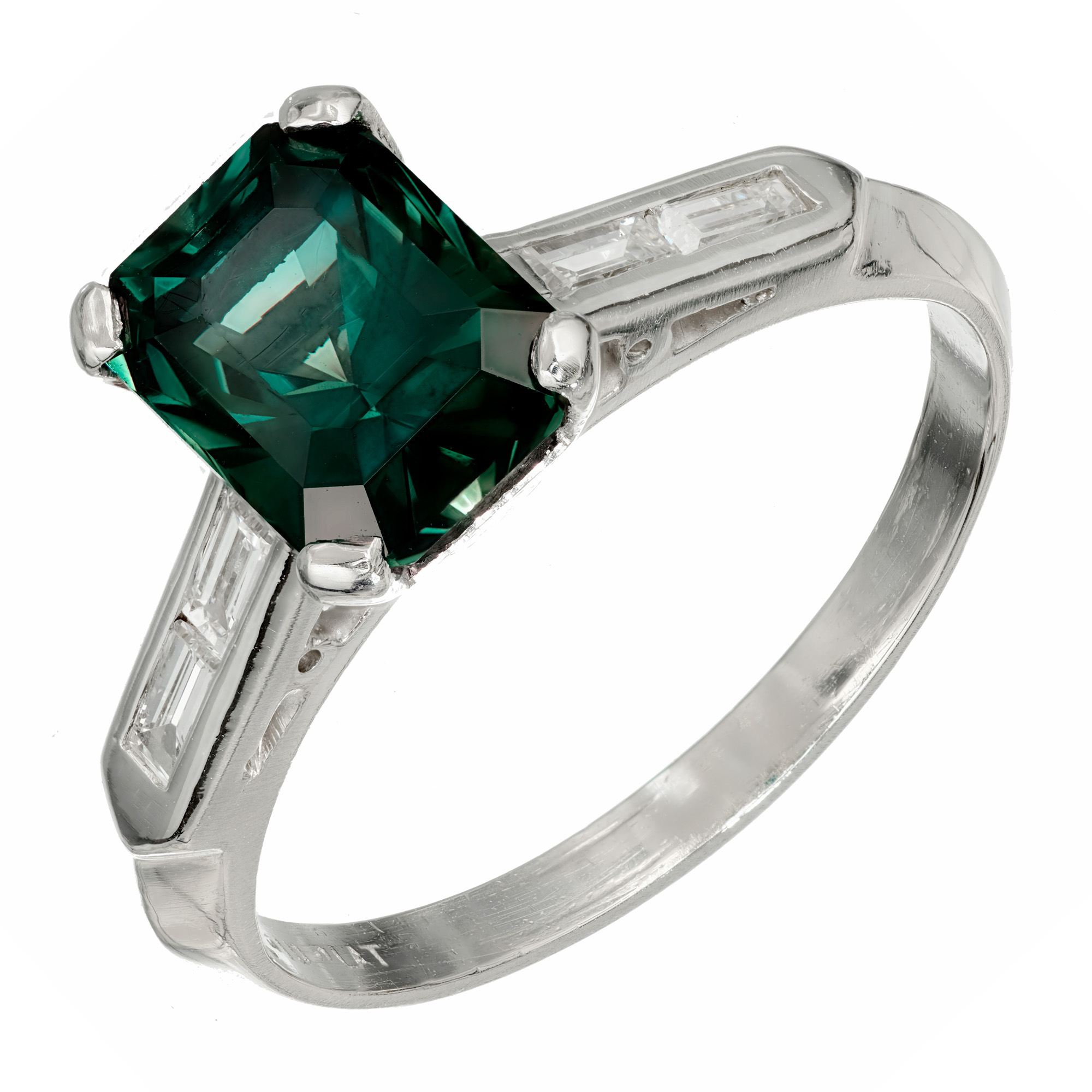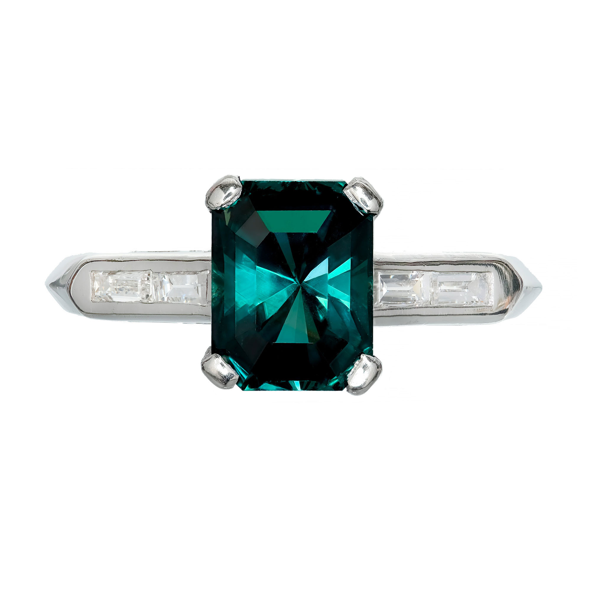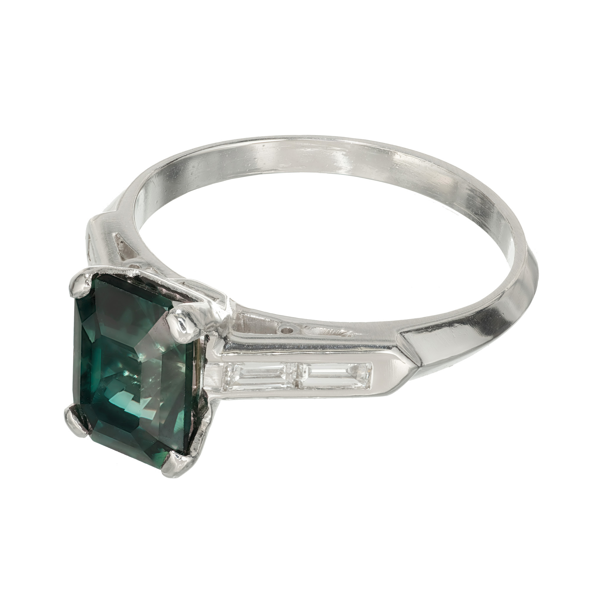 Green Sapphire and diamond engagement ring. Octagonal green sapphire center stone in a platinum setting with four baguette accent diamonds. The ring is designed to show off the rich natural, untreated greenish blue color of the sapphire. Crafted in the Peter Suchy workshop.