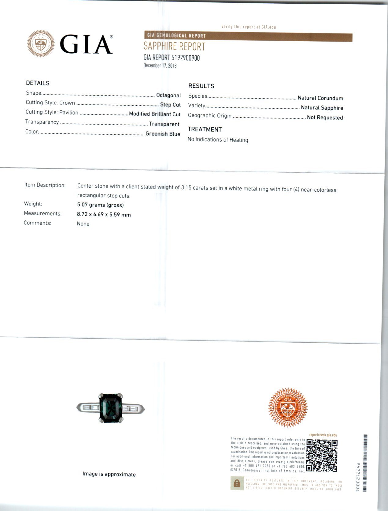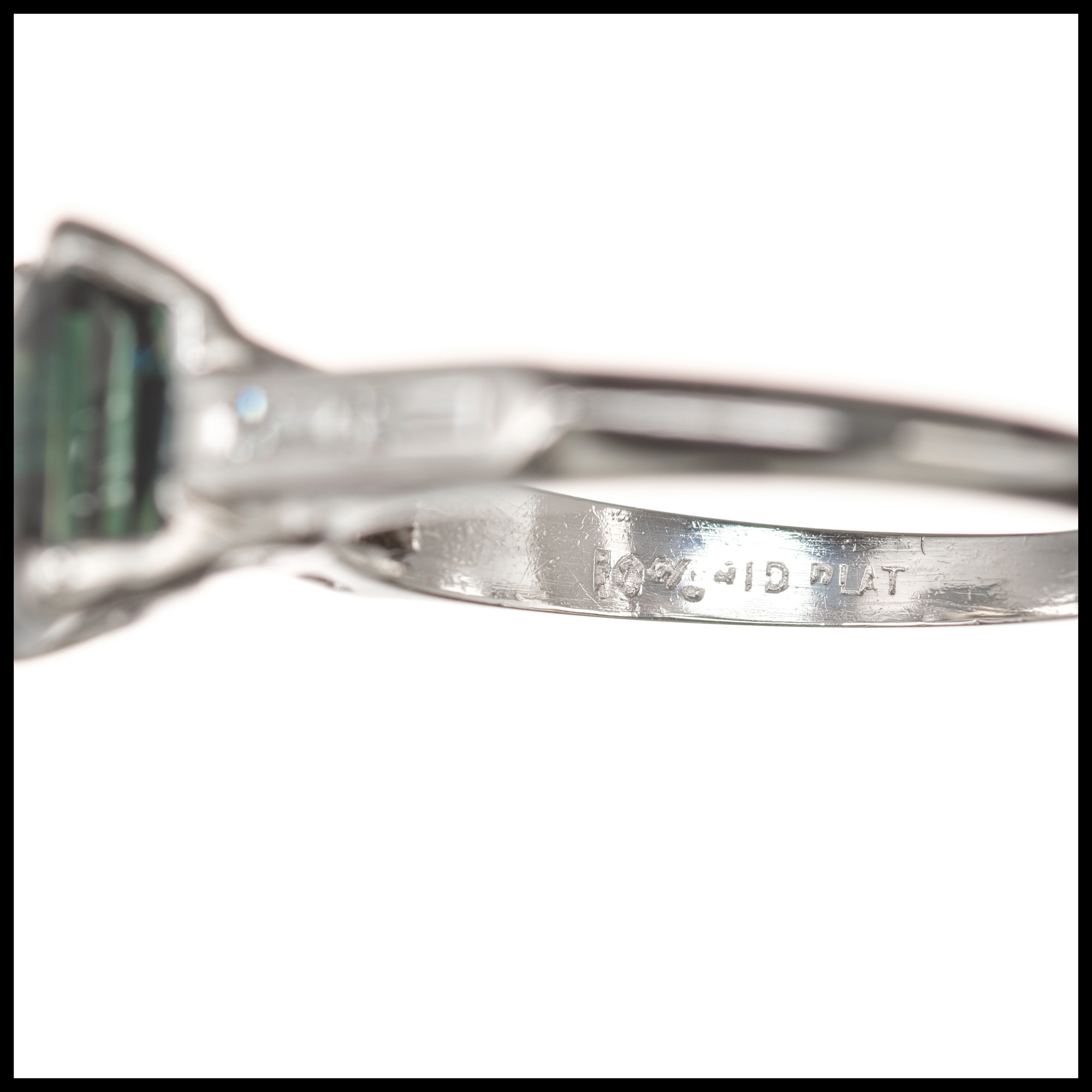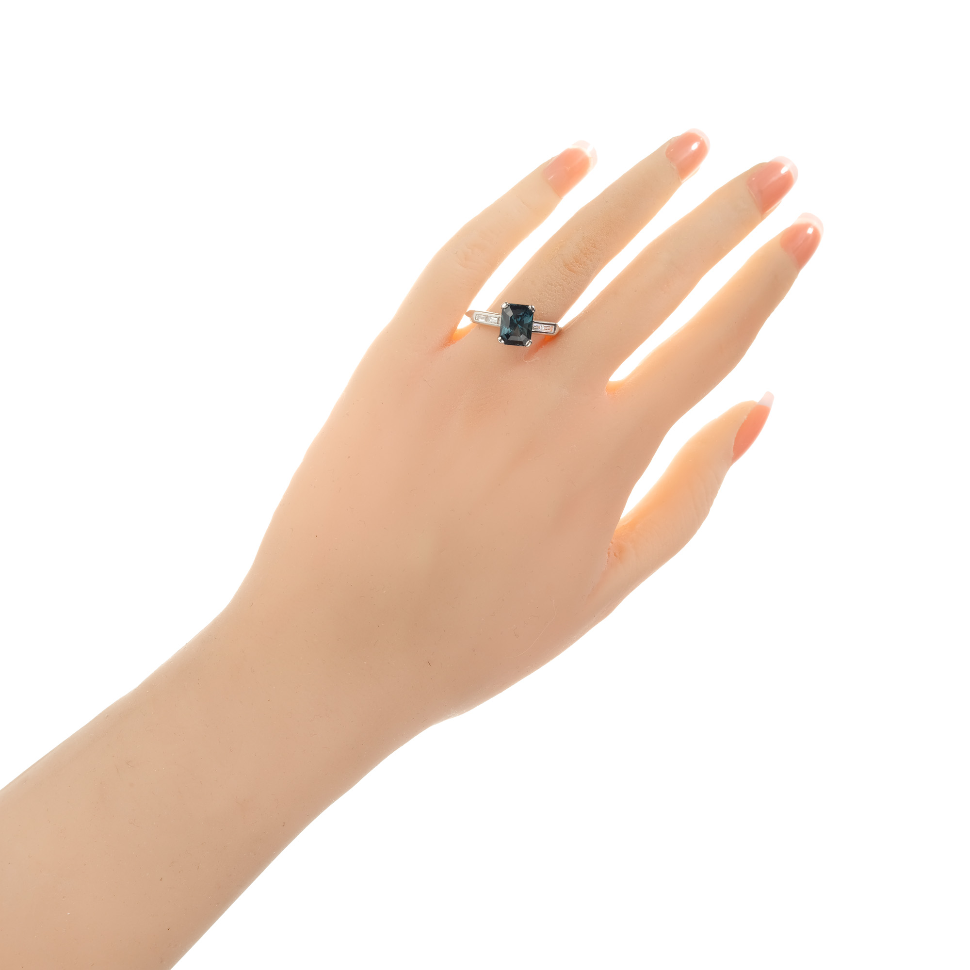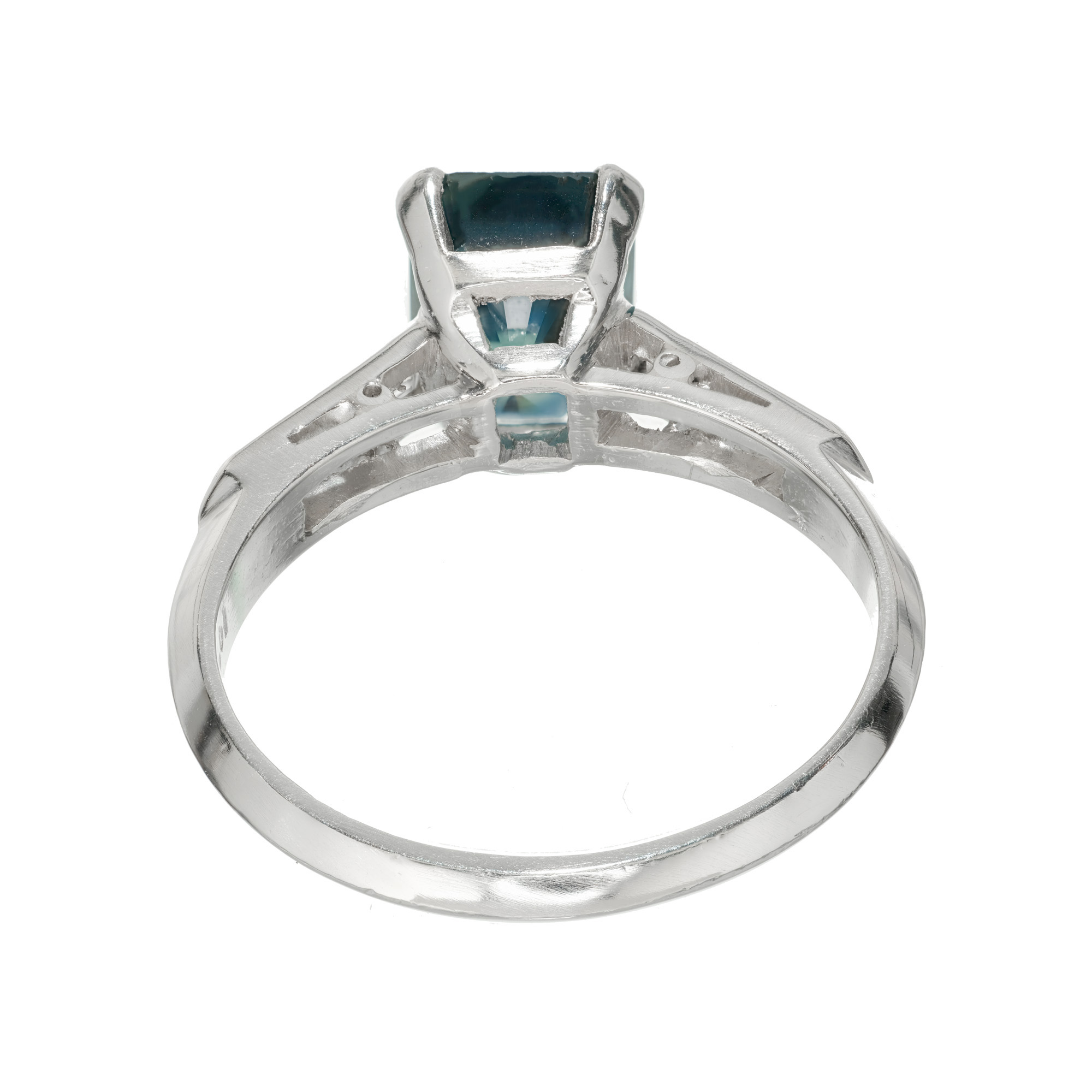 Green Sapphire and diamond engagement ring. Octagonal green sapphire center stone in a platinum setting with four baguette accent diamonds. The ring is designed to show off the rich natural, untreated greenish blue color of the sapphire. Crafted in the Peter Suchy workshop.